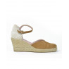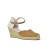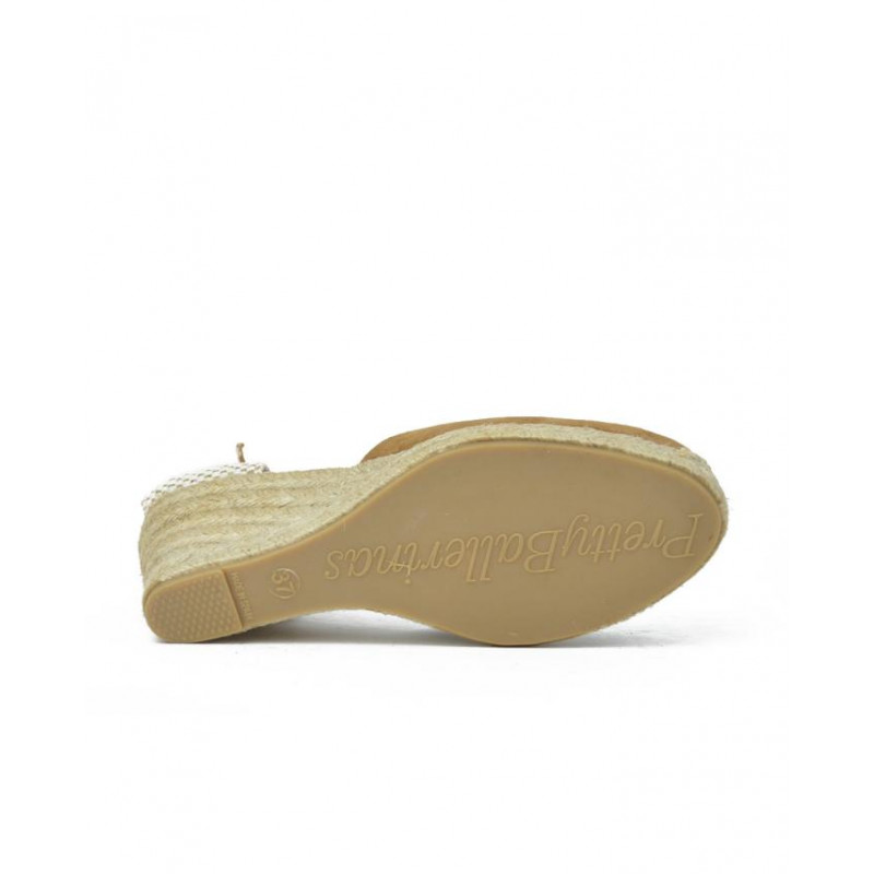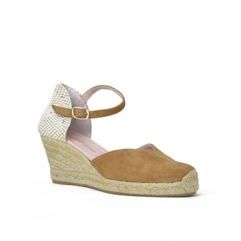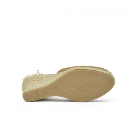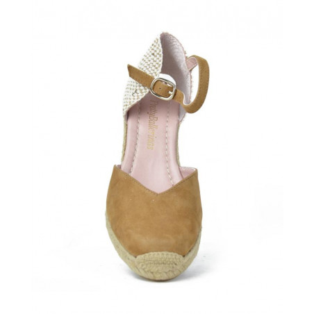 ALPARGATA ESPARTO marca PRETTY BALLERINAS modelo ESPARTO SEÑORA PUNTERA CERRADA PULSERA TRASERA. Fabricado en piel color camel, pulsera trasera con hebilla . Suela corrida personalizada.