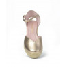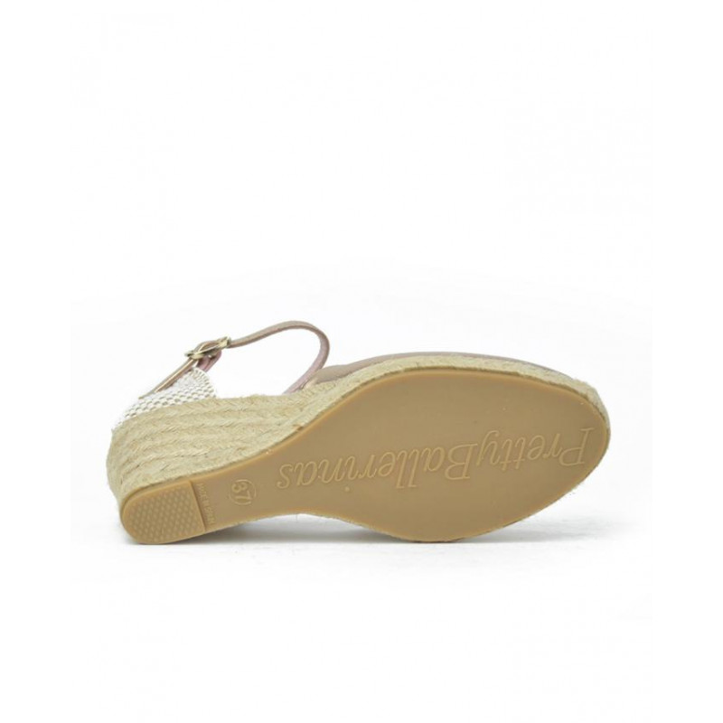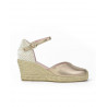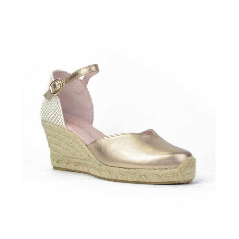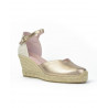 ALPARGATA ESPARTO marca PRETTY BALLERINAS modelo ESPARTO SEÑORA PUNTERA CERRADA PULSERA TRASERA. Fabricado en piel color champan, pulsera trasera con hebilla . Suela corrida personalizada.