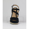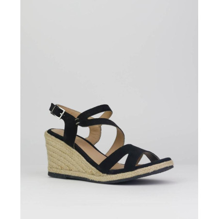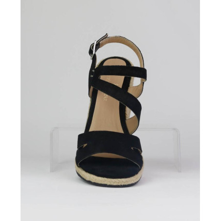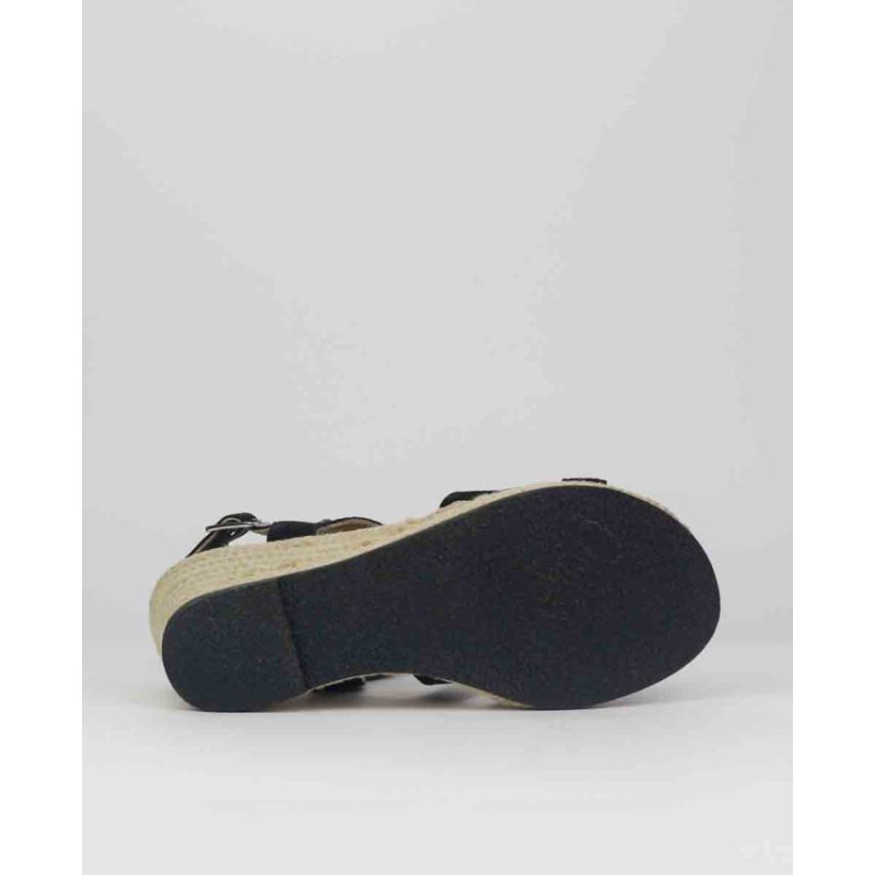 Sandalia cuña yute en ante negro. FAbricado en ante de calidad color negro con forro piel en planta y corte. Formado por dos piezas, una en pala y un trasero con cierre hebilla que lleva un pequeño elastico para mejorar la adaptación al pie. Altura de cuña de 8cm incluida plantilla y una plataforma de 2cm. Suela rugosa para mejorar agarre al suelo.