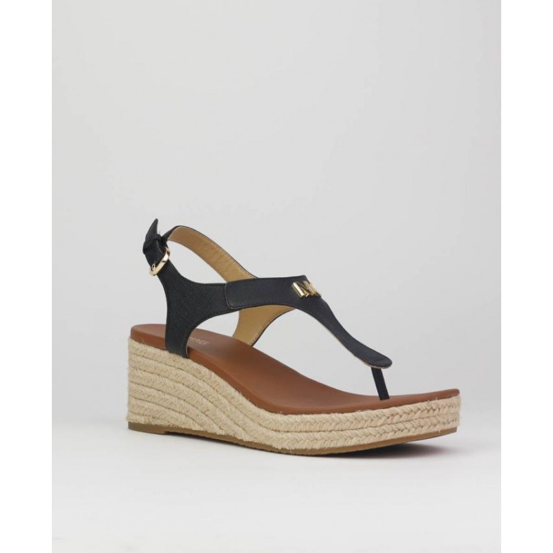 Sandalia cuña de dedo y placa frontal Michael Kors. Hebilla lateral. Piel. Forro mezcla poliuretano. Cuña de yute 6,4cm y plataforma 1,9cm. Cierre hebilla.
