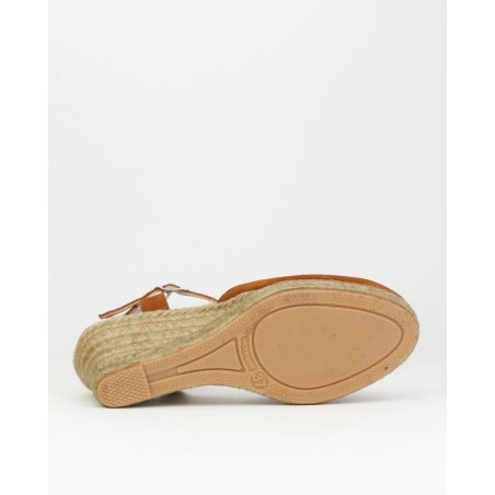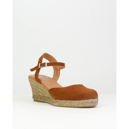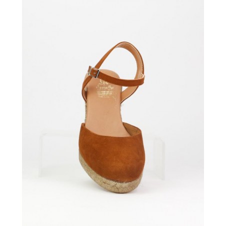 Alpargata yute en ante color cuero. Planta en piel. Altura de suela 5.5 cm y 2 cm en puntera. Trasero con hebilla como ajuste. Fabricado en España