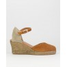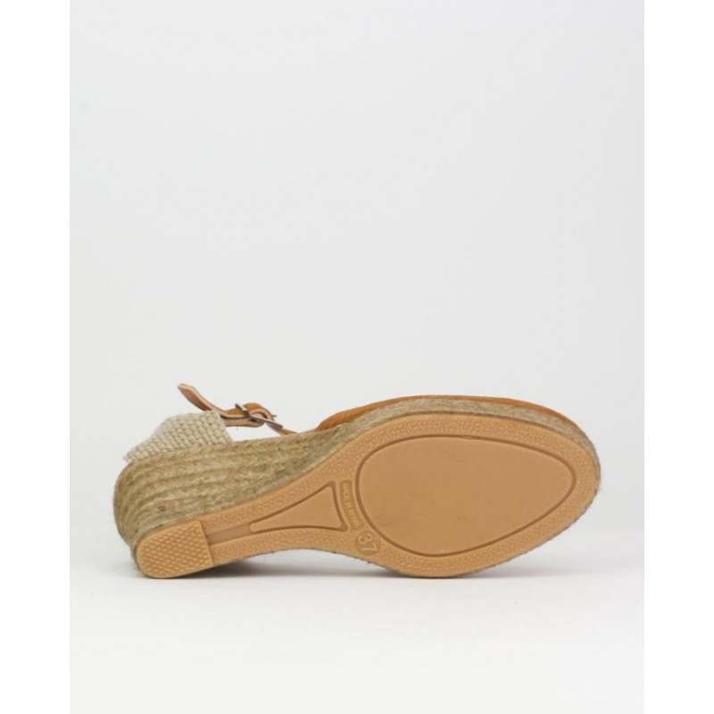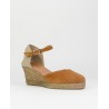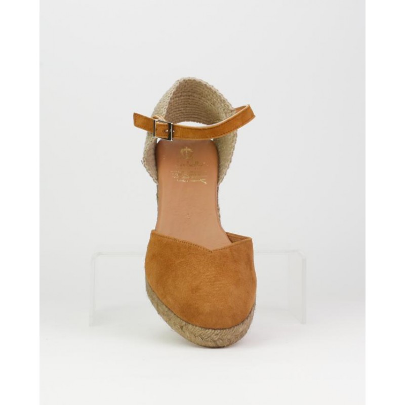 Alpargata yute El Caballo. Fabricado en ante de calidad superior en color cuero. Planta en piel con anagrama oro. Talón mecanico con tira de piel y hebilla para ajuste al pie. Fabricado en España de forma artesana