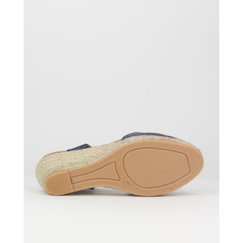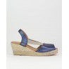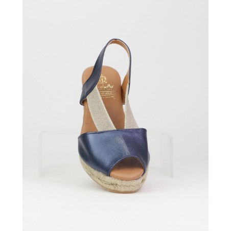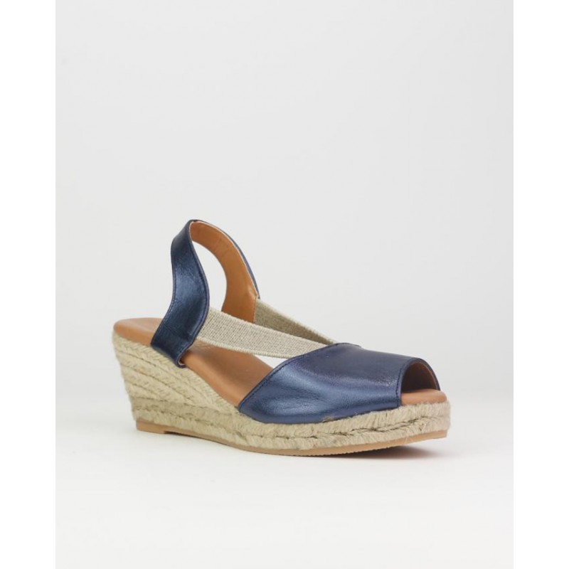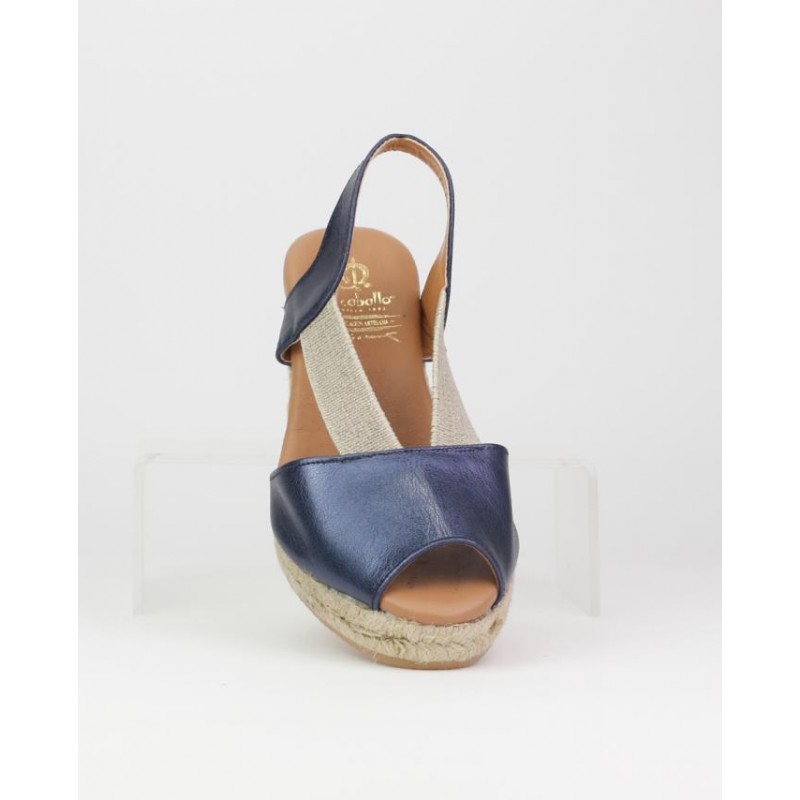 Alpargata yute El Caballo. Fabricado en piel azul metalizado. Planta en piel con anagrama de marca estampado oro. Elastico a modo de ajuste. Altura de suela 5.5 cm y 2 cm de plataforma. Fabricado en España