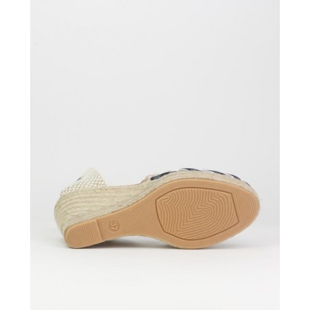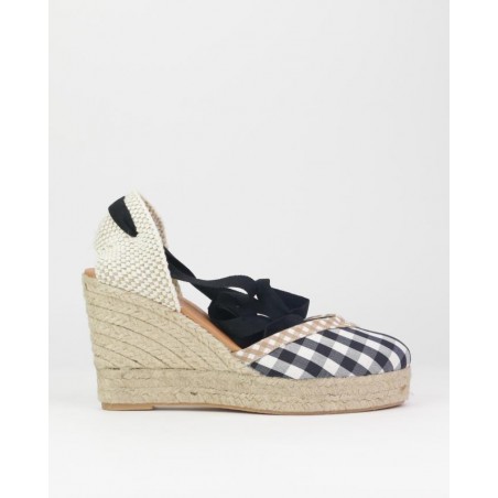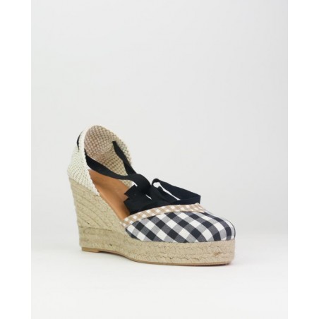 Alpargata yute El Caballo .Fabricado en tejido vichi negro y blanco. Talón mecanico con cintas para ajuste al pie. Altura de suela 8 cm y 2 cm de plataforma. Fabricado en España de forma artesana