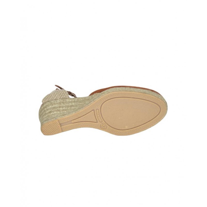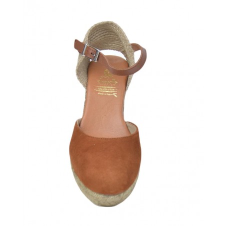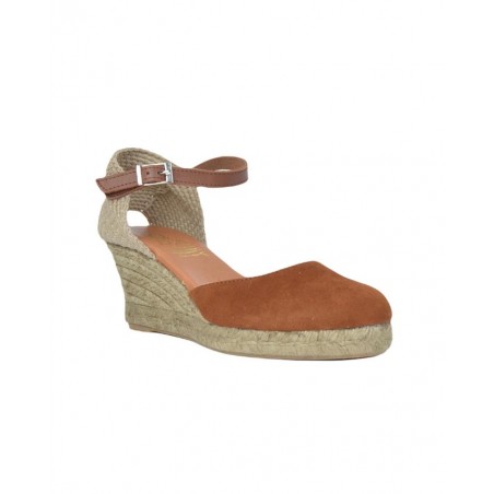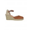 Alpargata yute marca el caballo en piel ante. Fabricado en españa en color cuero. Talón mecánico con tira en ante al tono. Cierre hebilla. Altura de cuña 5.5 cm plataforma de 2cm