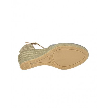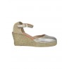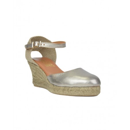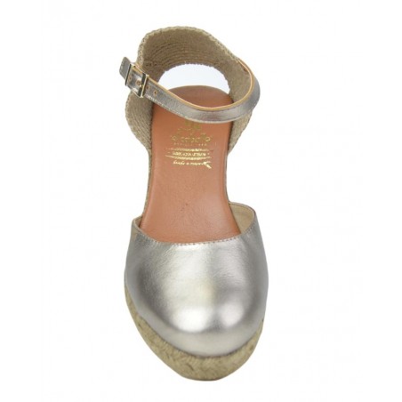 Alpargata yute El caballo en piel metalizado caldera. Fabricado en España. Planta de piel. Talón mecánico con cinta en piel al tono. Cierre hebilla. Altura de cuña 5.5 cm y plataforma de 2 cm