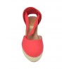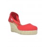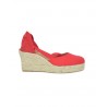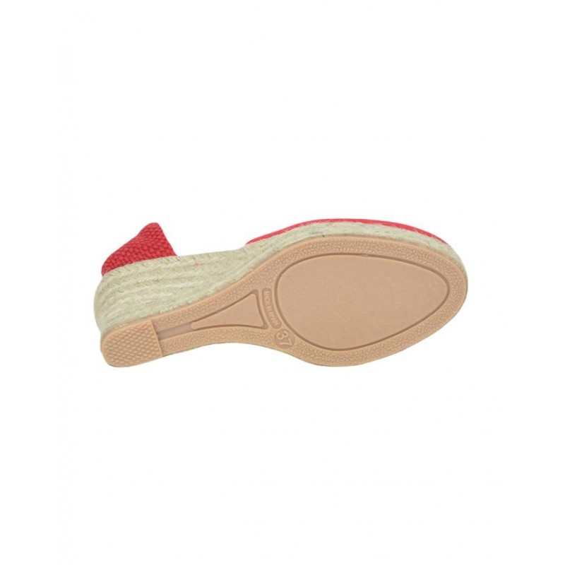 Valenciana yute en tejido rojo pique. Alpargata con cintas trasero para sujeccion a pierna. Planta en piel. Fabricado en España. Altura de cuña 6.5 cm y 3 cm de plataforma.