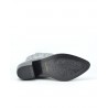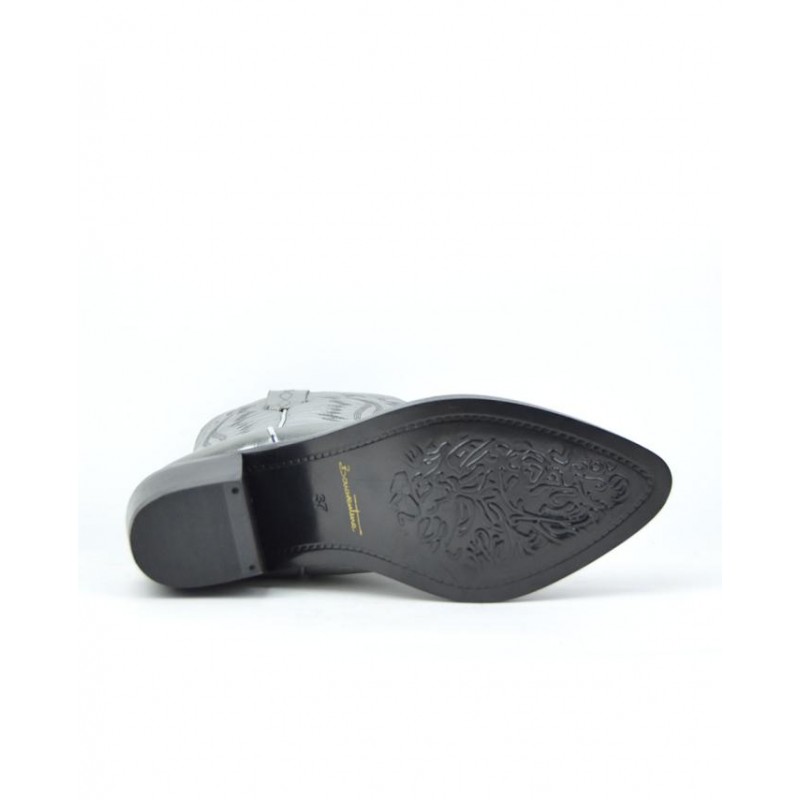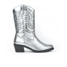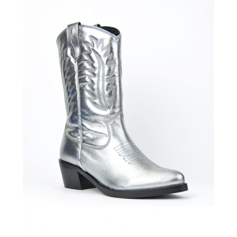 Bota señora cowboy de Bonaventure fabricada en piel color plata metal con caña pespunteada y vivo central, forro textil con vista de piel, plantilla piel, suela con tacón de 5 cm, caña de 24,5 cm altura. Composición: Empeine: Piel. Forro: Textil. Plantilla: Piel. Suela: Fibra sintética. Componente principal: Piel.