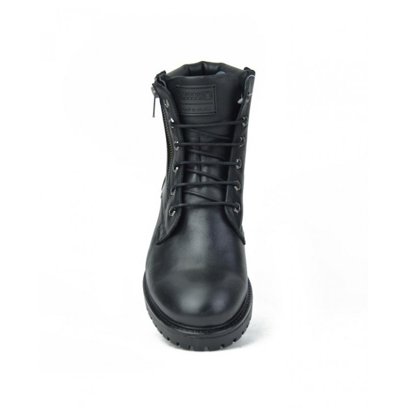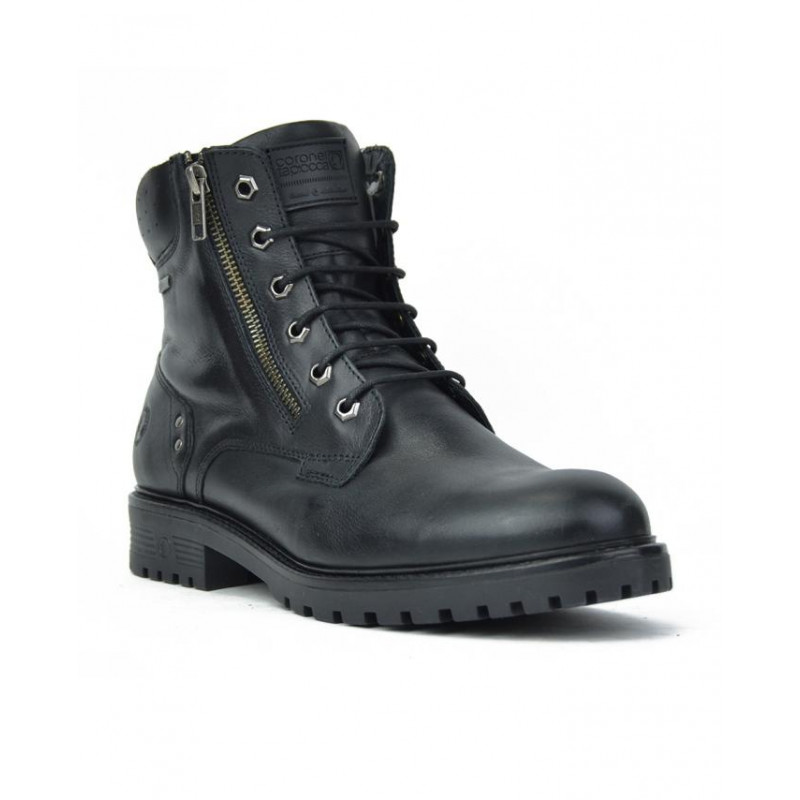 Botas caballero Coronel Tapiocca fabricadas en piel negro, cierre de cordones y cremallera exterior, forro combinado piel vacuno y textil con membrana resistente al agua con tecnología XDRY, plantilla textil extraible termoconformada, altura de caña 14 cm, suela con 3,5 cm de tacón y 1,5 cm de plataforma, fabricadas en España. Composición: Empeine: Piel. Forro y plantilla: Textil. Suela: Fibra sintetica. Componente principal: Piel
