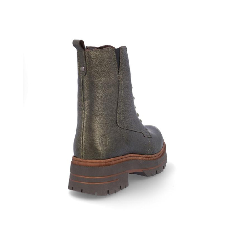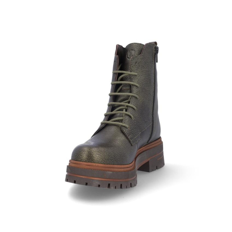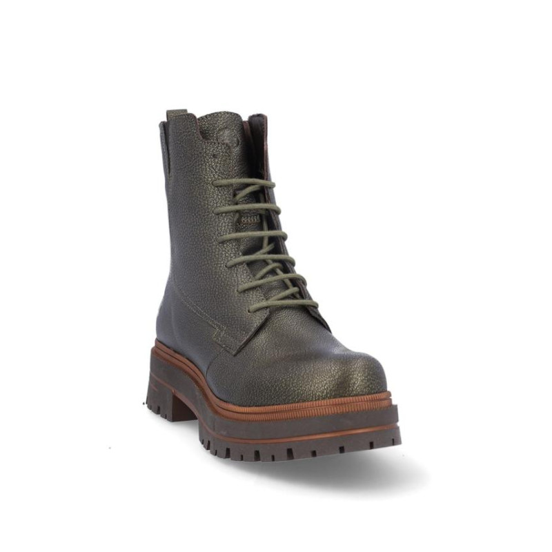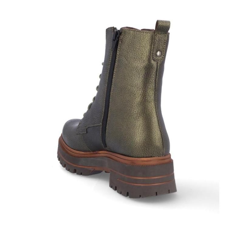 Botas de señora Coronel Tapiocca fabricados en piel color oliva metalizado, cierre con cordones y cremallera en parte interior para facilitar la puesta y retirada del producto. Forro textil con vista de piel, plantilla textil extraible termoconformada, altura de caña 18 cm, suela con tacón de 5 cm y plataforma de 3'5 cm de altura. Fabricado en España. Composición: Empeine: Piel . Forro: Piel/textil. Plantilla: Textil. Suela: Fibra sintetica. Componente principal: Piel