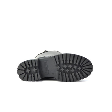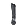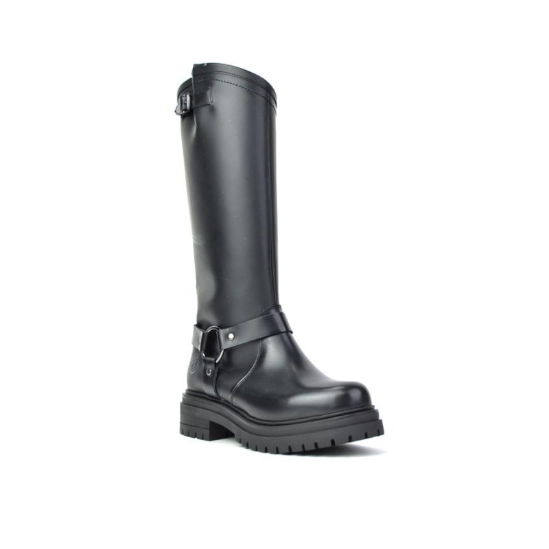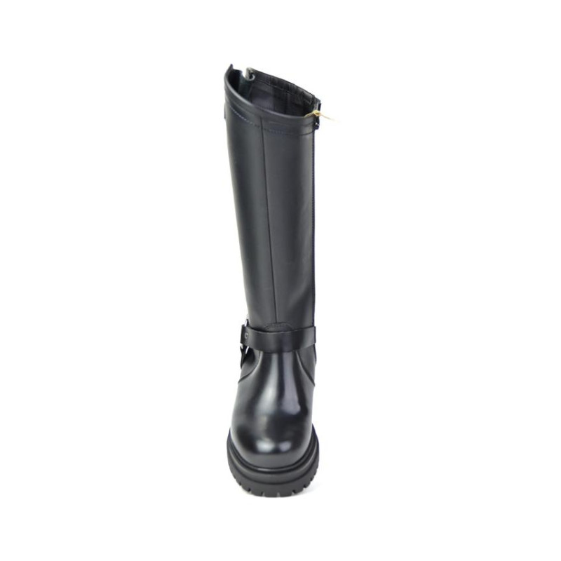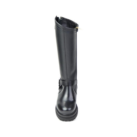 Bota motera en piel negro florenti. Fabricado en España. Altura de caña 33 cm. Altura de tacón 4.5 cm y plataforma de 3 cm. Cierre cremallera. Composicion: Exterior: Piel. Interior. Tejido. Suela. Otros materiales.