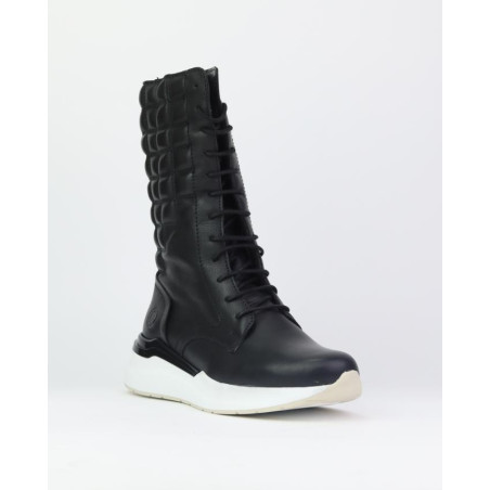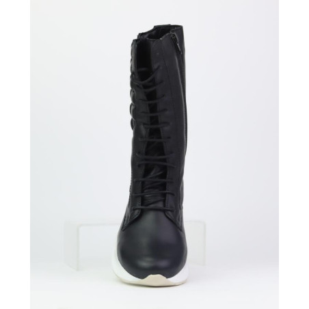 Botas con cordones Coronel Tapiocca Mujer C1270-11 en color negro. Fabricado en piel vacuno de calidad en color negro. Suela con aplique metálico en trasero a modo de decoración. Cordones como ajuste al pie y caña, además de una cremallera interior para facilitar la retirada y puesta en el pie. Forro tejido. Plantilla extrailbe termoconformada muy cómoda. Pesupuntes generando cuadros a modo decorativo en caña. Altura de caña 22 cm. Altura de suela 4cm y en puntera 2cm. Fabricado en España en instalaciones propias. Bota sneaker, mezcla de estilo tan actual en la presente temporada