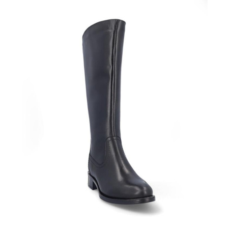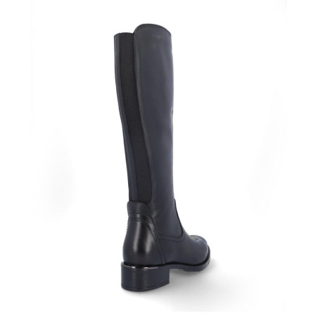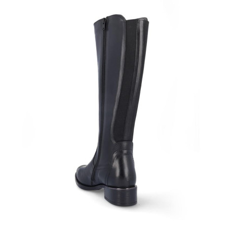 Botas de señora Caramelo fabricados en piel color negro, con elasticos en la parte trasera. Forro textil con vista de piel, plantilla piel, con cremallera en la parte interior para facilitar la puesta y retirada del producto, altura de caña 38 cm, suela con tacon de 3'5 cm y plataforma de 1 cm altura. Composición: Empeine: Piel. Forro: Piel/textil. Plantilla: Piel. Suela: Componente principal: Piel