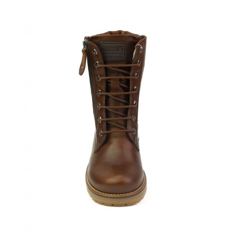 Botas impermeables Coronel Tapiocca Mujer Cuero C1231-13. Fabricadas en piel color cuero en piel vacuno de primera calidad. Cierre cordones y una cremallera exterior con uso para ajuste al pie. Forro textil con membrana resistente al agua con sistema XDRY. Plantilla extraible termoconformada muy cómoda. Altura de caña de 16 cm. Altura de tacón en suela 4cm y 2 cm en punta. Fabricado en España.