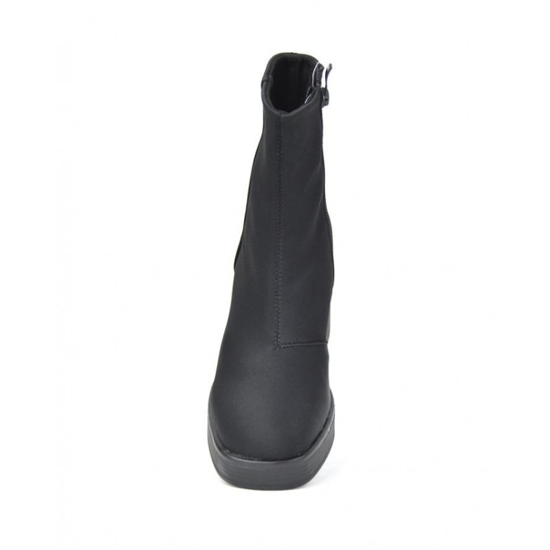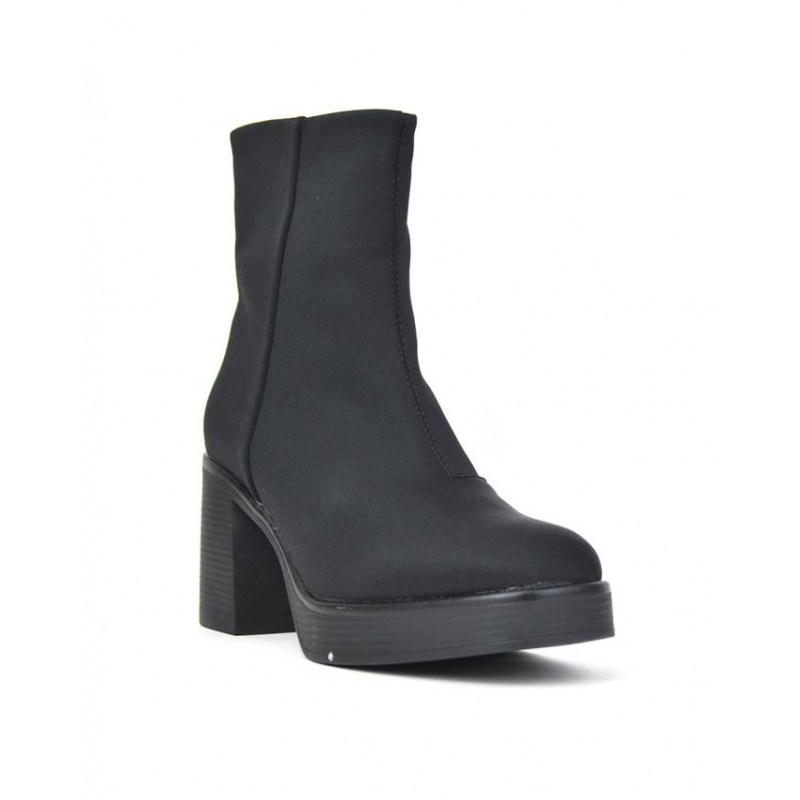 Botín señora de Javier Larrainzar fabricado en material licra negro con suela de tacón de 8 cm y 2.5 cm de plataforma. Composición: Empeine: textil. Forro: textil. Plantilla: otros materiales. Suela: Fibra sintética.