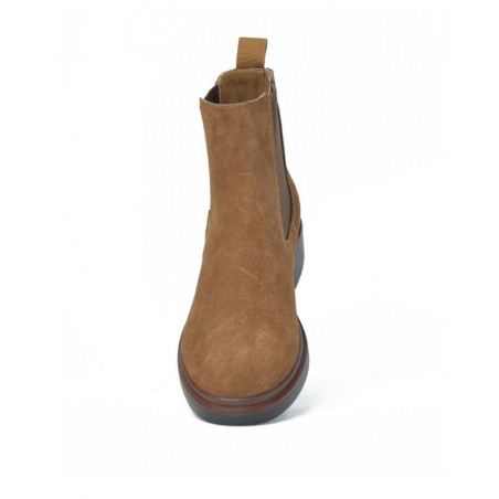 Botines de señora Bonaventure fabricados en serraje tierra repelente al agua, forro textil con vista de piel, plantilla textil, con elásticos laterales, caña de 13 cm altura, suela con tacón de 4 cm y plataforma de 2 cm. Composición: Empeine:Serraje. Forro: Piel/textil. Plantilla: Textil. Suela: Fibra sintetica. Componente principal: Serraje