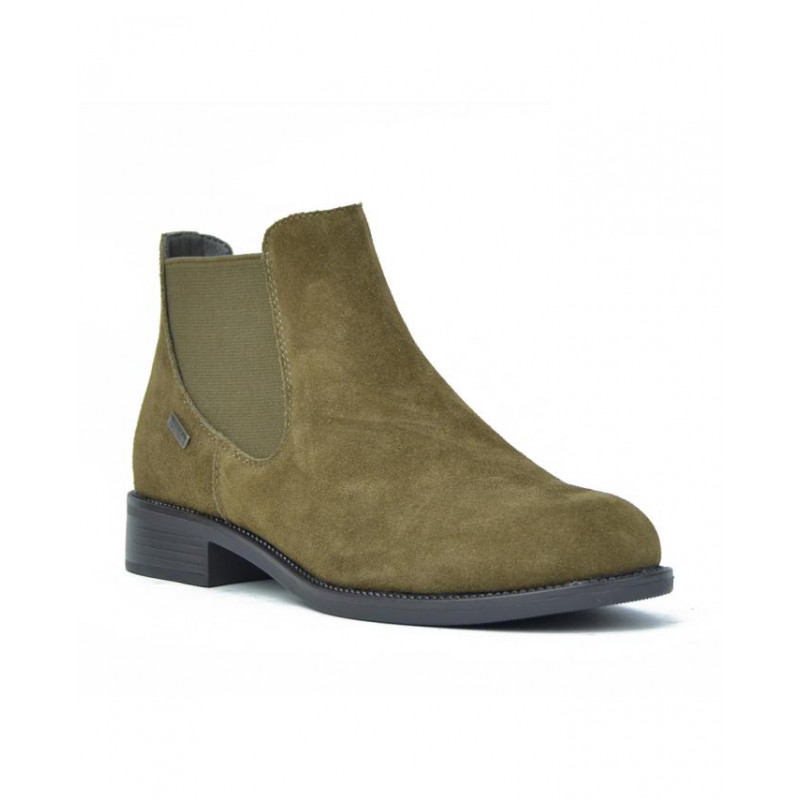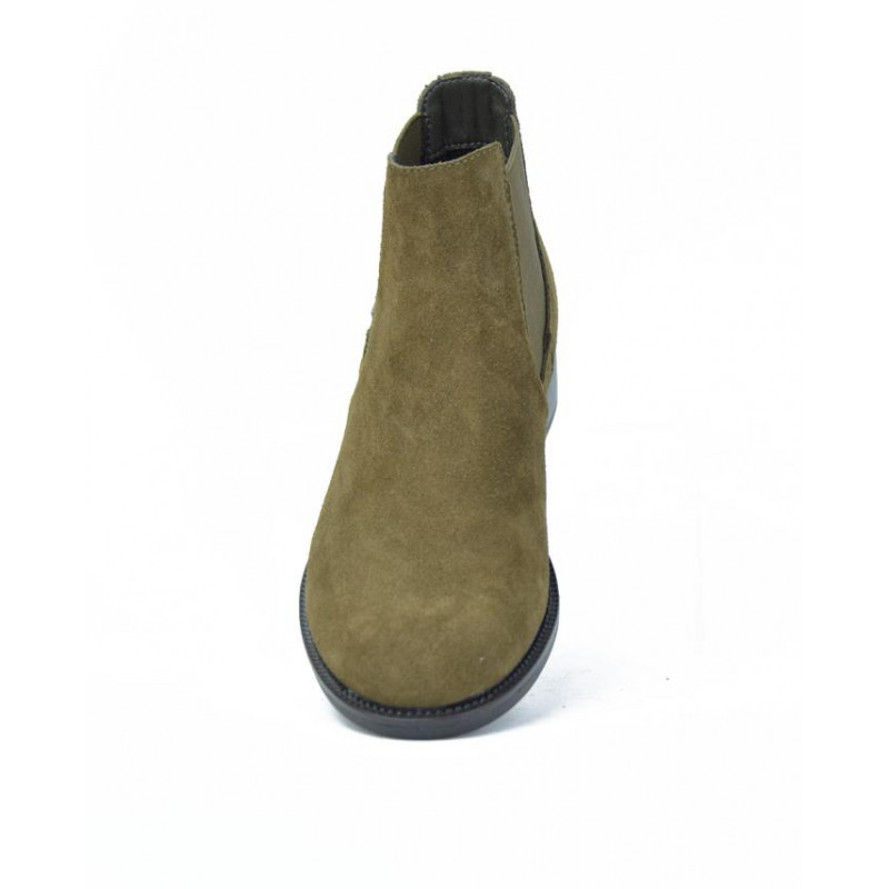 Botines de señora Bonaventure fabricados en serraje kaki repelente al agua, forro textil con vista de piel, plantilla textil, con elásticos laterales para un mayor ajuste , caña de 12 cm altura, suela con tacón de 3 cm y plataforma de 1 cm. Composición: Empeine:Serraje. Forro: Piel/textil. Plantilla: Textil. Suela: Fibra sintetica. Componente principal: Serraje
