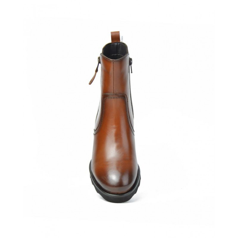 Botines de señora Caramelo fabricados en piel cuero, cierre con cremallera exterior de uso para la puesta y retirada con un tirador, forro textil con vista de piel, plantilla piel. Suela con tacón de 5 cm altura y 1,5 cm en puntera, caña de 15 cm altura. Composición: Empeine: piel. Forro: Piel/Textil. Plantilla: Piel. Suela: Fibra sintética. Componente principal: piel