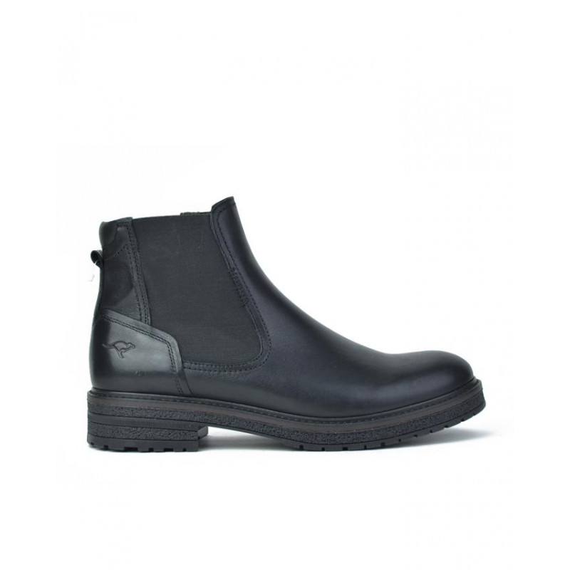 Botines hombre Kangaroos fabricados en piel negro, elástico laterial y cremallera interior para facilitar la puesta y retirada del producto, forro combinado piel vacuno y tejido, plantilla textil extraible termoconformada, caña de 14 cm altura, suela con tacón de 4 cm y plataforma de 2,5 cm, fabricado en España. Composición: Empeine: Piel. Forro: Piel/Textil, Plantilla: Textil. Suela: Fibra sintetica. Componente principal: Piel