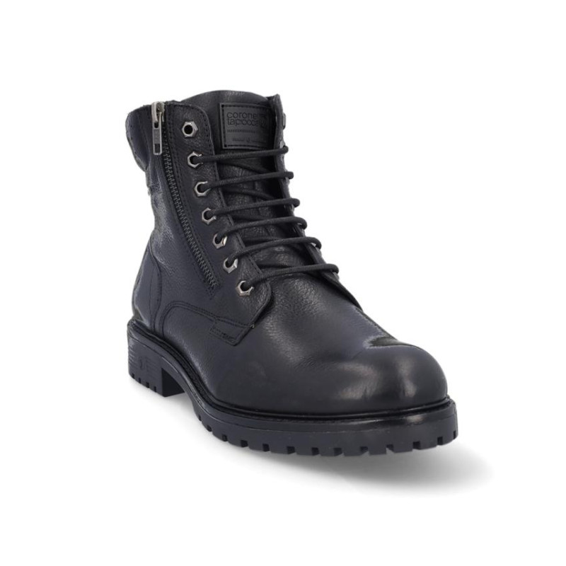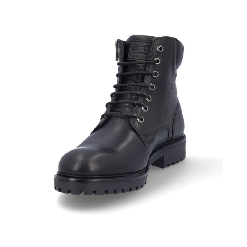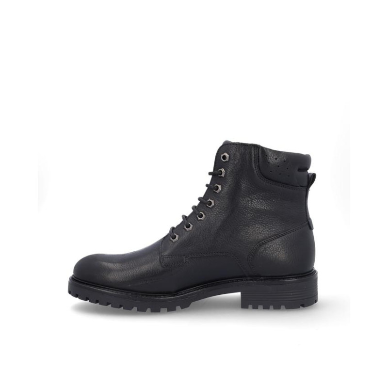 Botas de caballero Coronel Tapiocca en piel negro, con membrana resistente al agua y tecnología XDRY. Cierre de cordones y cremallera en el lateral exterior, Forro textil con vista de piel, plantilla textil extraible termoconformada, altura de caña 14 cm, suela con tacon de 4 cm y plataforma de 2 cm altura. Fabricado en España. Composición: Empeine: Piel . Forro: Piel/textil. Plantilla: Textil. Suela: Fibra sintetica. Componente principal: Piel