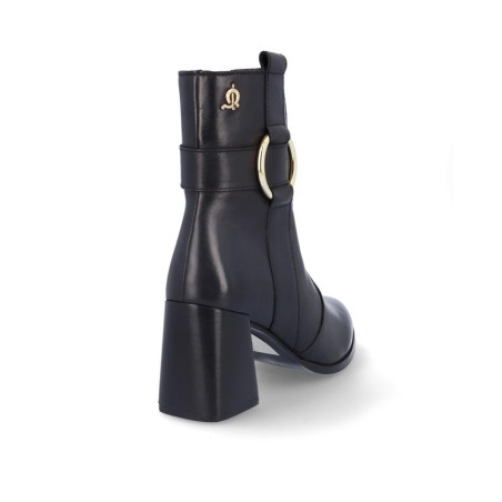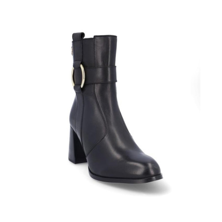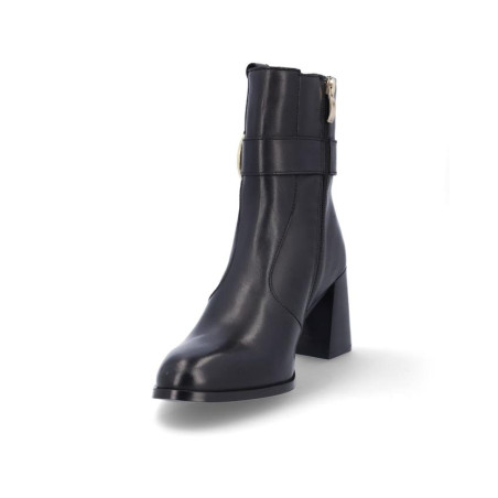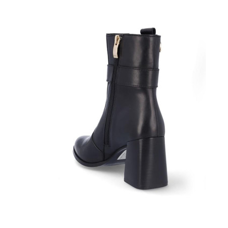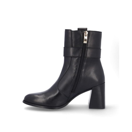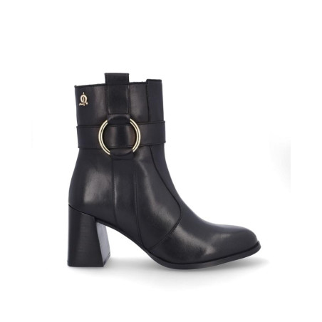 Botines de señora El Caballo fabricados en piel color negro, con adorno metialico en la parte exterior. Forro textil con vista de piel, plantilla textil, con cremallera en la parte interior para facilitar la puesta y retirada del producto, altura de caña 15 cm, suela con tacon de 7'5 cm y plataforma de 1 cm altura. Composición: Empeine: Piel. Forro: Piel/textil. Plantilla: textil. Suela: Fibra sintetica. Componente principal: Piel