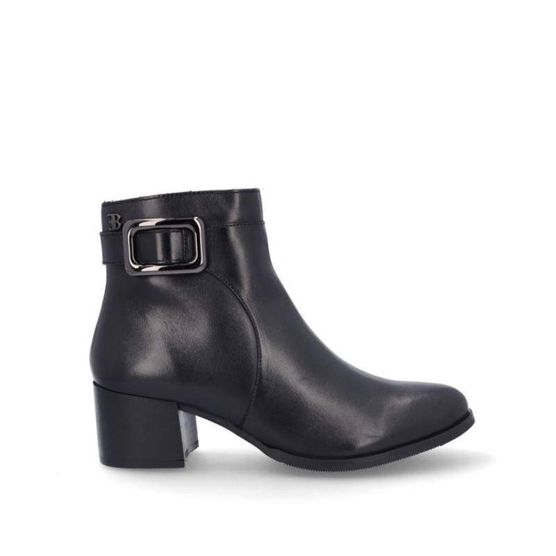 Botines de señora Elio Berhanyer fabricados en piel color negro, con hebilla decorativa en parte exterior. Forro textil con vista de piel, plantilla piel, con cremallera en la parte interior para facilitar la puesta y retirada del producto, altura de caña 13 cm, suela con tacon de 5 cm y plataforma de 1 cm altura. Composición: Empeine: Piel. Forro: Piel/textil. Plantilla: Piel. Suela: Fibra sintetica. Componente principal: Piel