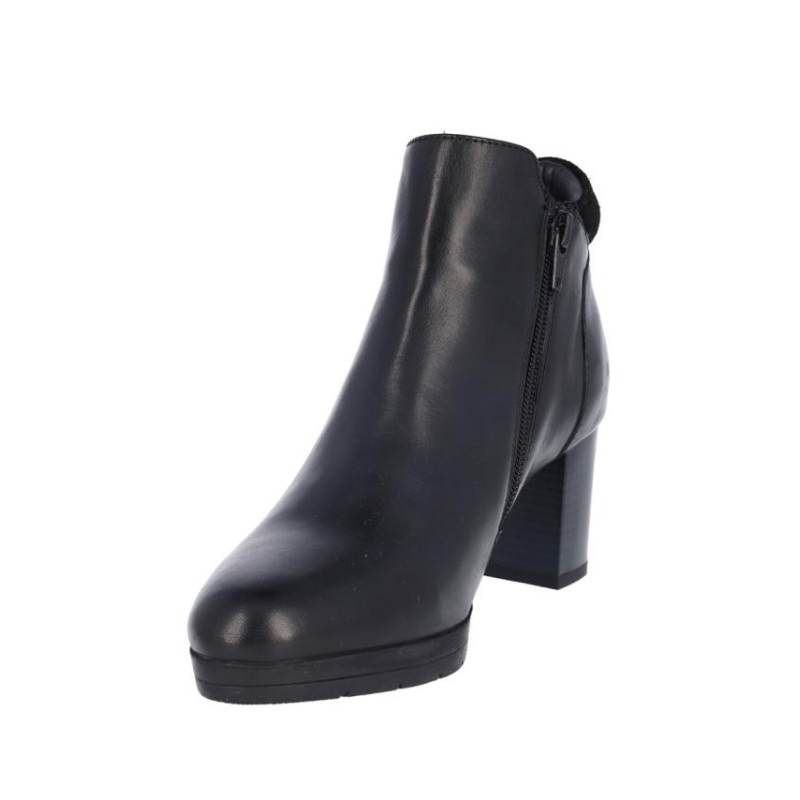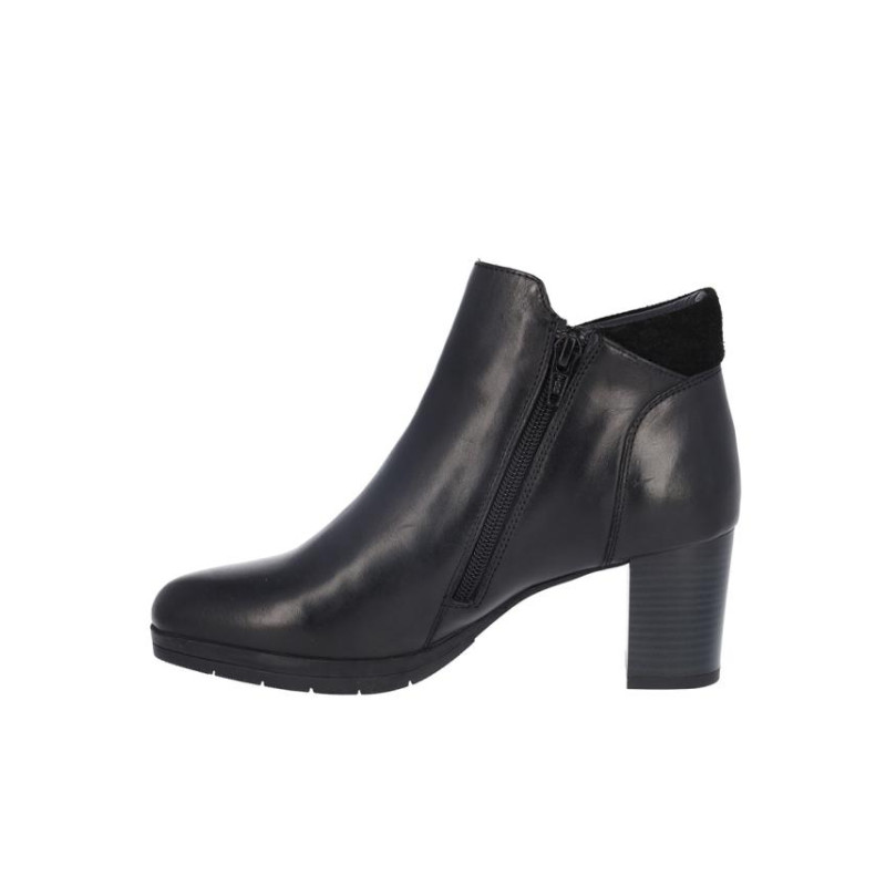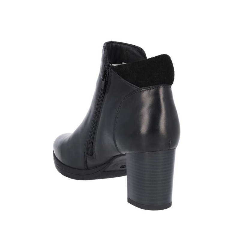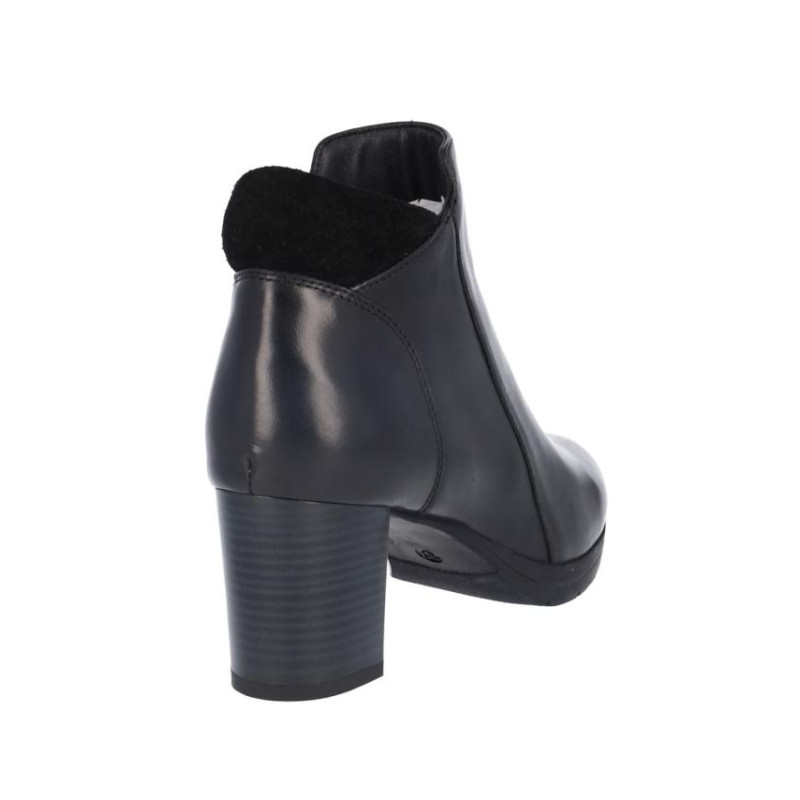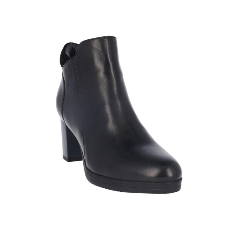 Botines de señora Javier Larrainzar fabricados en piel color negro, forro textil con vista de piel, plantilla piel, con cremallera en parte interior para facilitar la puesta y retirada del producto, altura de caña 9'5 cm, suela con tacon de 6 cm y plataforma de 1'5 cm altura. Composición: Empeine: Piel. Forro: Piel/textil. Plantilla: Piel. Suela: Fibra sintetica. Componente principal: Piel
