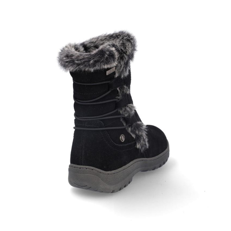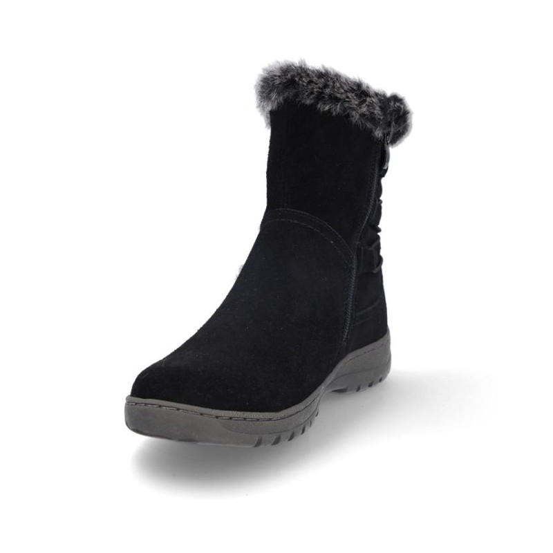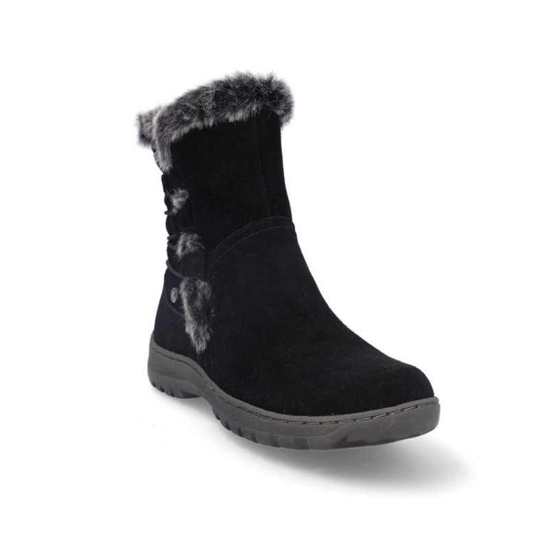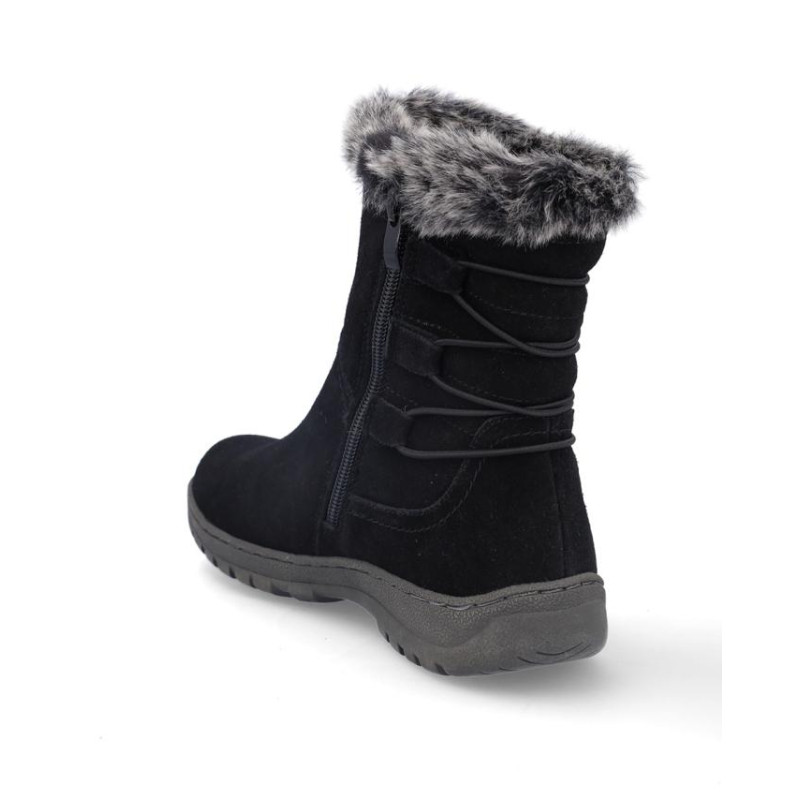 Botines impermeables de señora Coronel Tapiocca en serraje color negro con pelo en parte superior, forro de pelo textil, plantilla textil, con cremallera en parte interior para facilitar la puesta y retirada, altura de caña 16 cm, suela de 3 cm altura. Composición: Empeine: Serraje. Forro: Textil. Plantilla: textil. Suela: Fibra sintética. Componente principal: Serraje