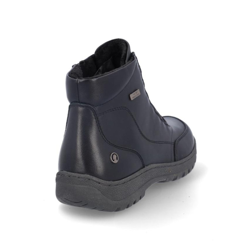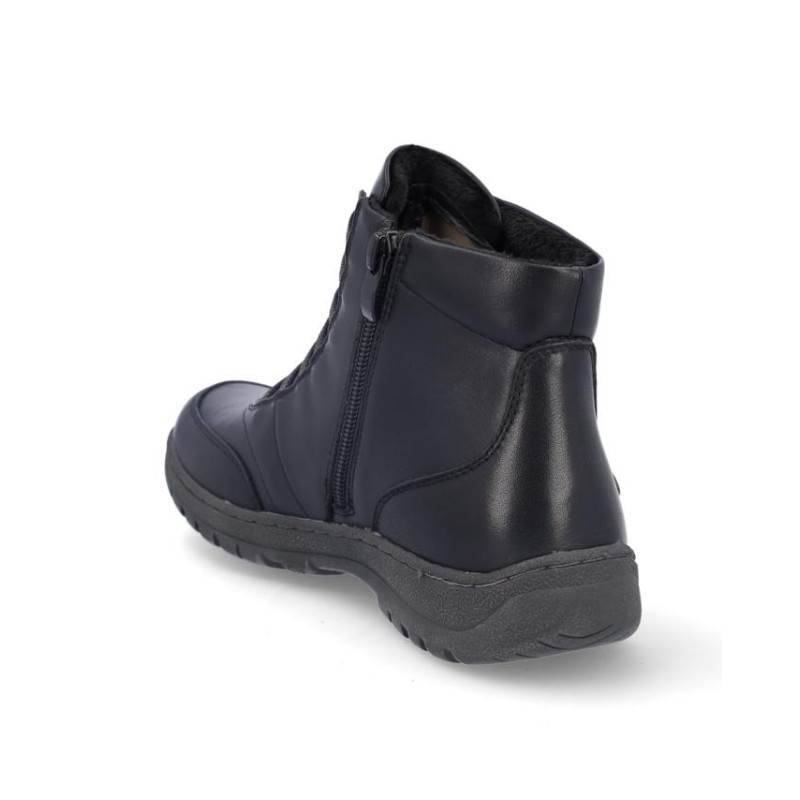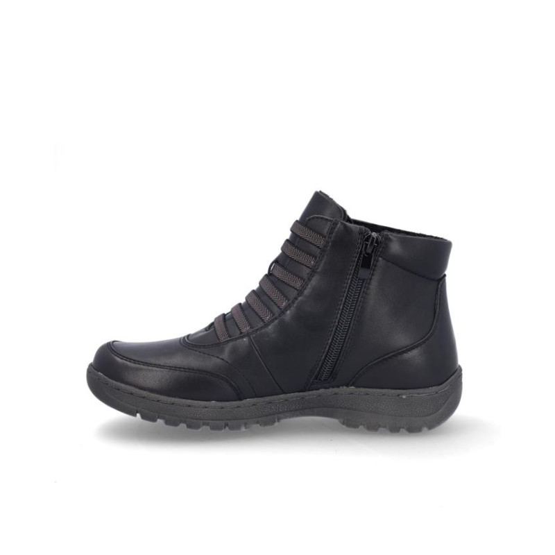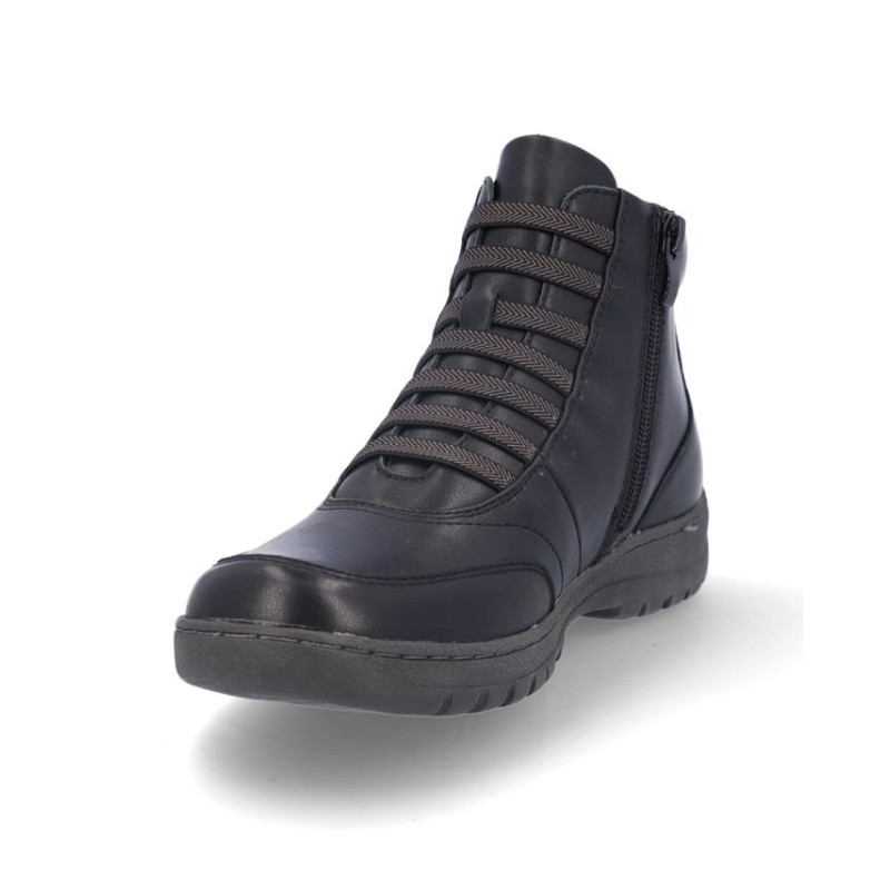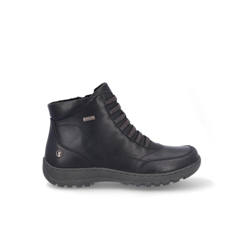 Botines de señora Coronel Tapiocca en piel color negro resistente al agua. Cierre con cordones elasticos y cremallera en parte interior para facilitar la puesta y retirada, forro textil, plantilla textil. Altura de caña 11 cm, suela de 3 cm de altura. Composición: Empeine: Piel. Forro: Textil. Plantilla: textil. Suela: Fibra sintética. Componente principal: Piel