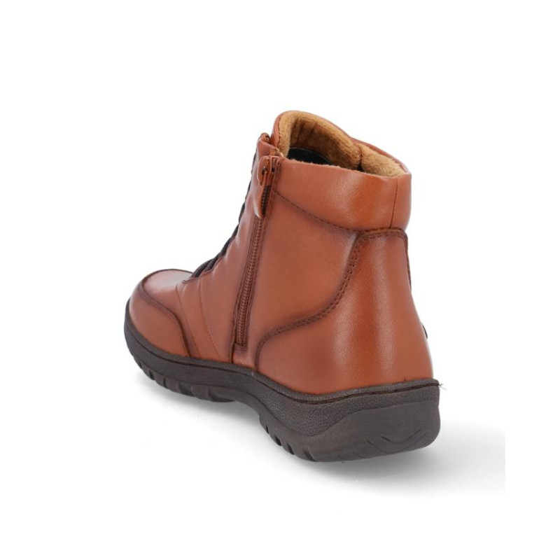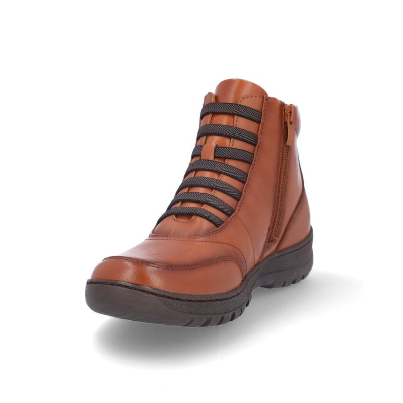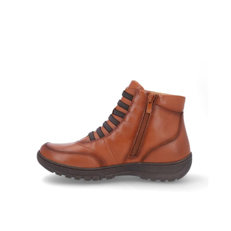Botines de señora Coronel Tapiocca en piel color camel resistente al agua. Cierre con cordones elasticos y cremallera en parte interior para facilitar la puesta y retirada, forro textil, plantilla textil. Altura de caña 11 cm, suela de 3 cm de altura. Composición: Empeine: Piel. Forro: Textil. Plantilla: textil. Suela: Fibra sintética. Componente principal: Piel