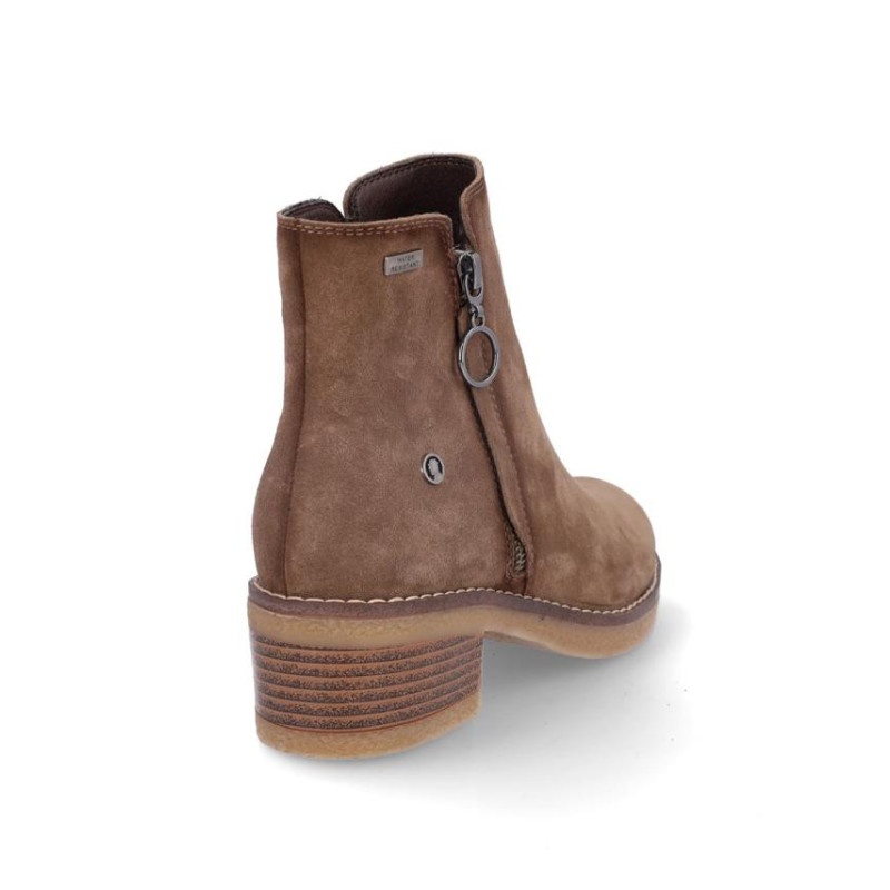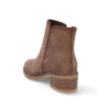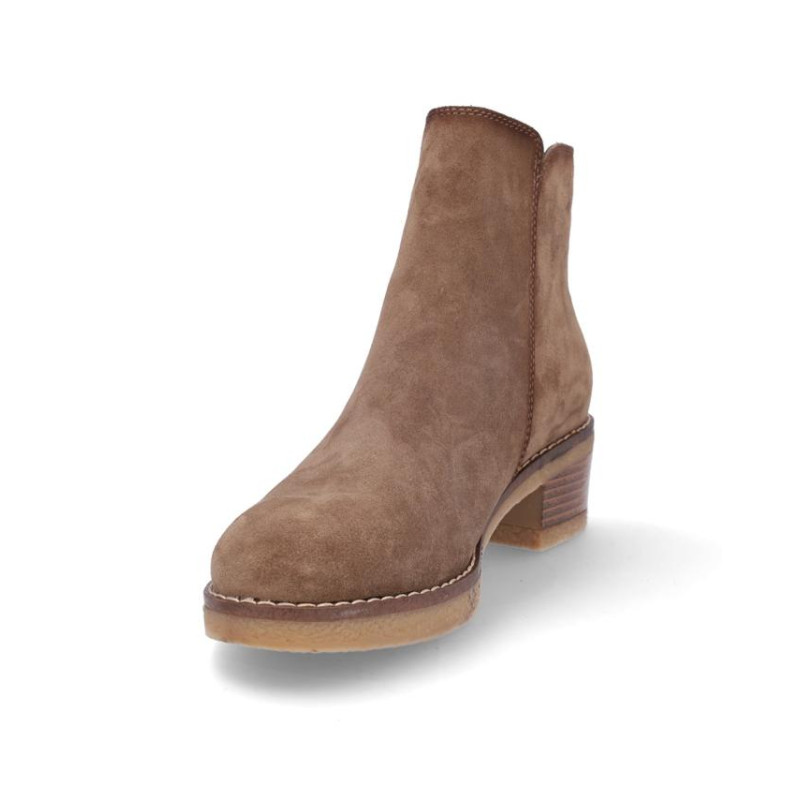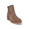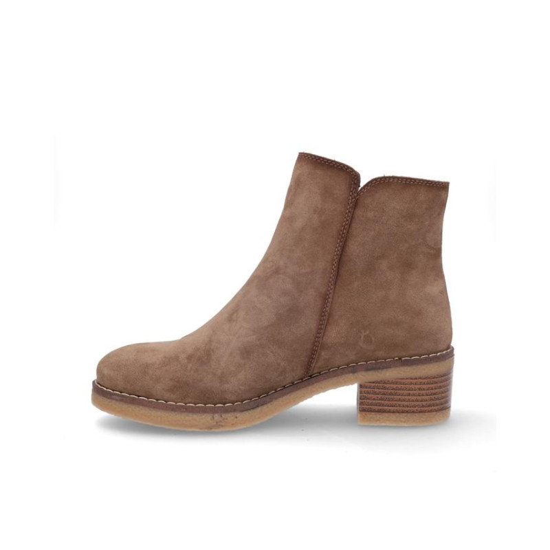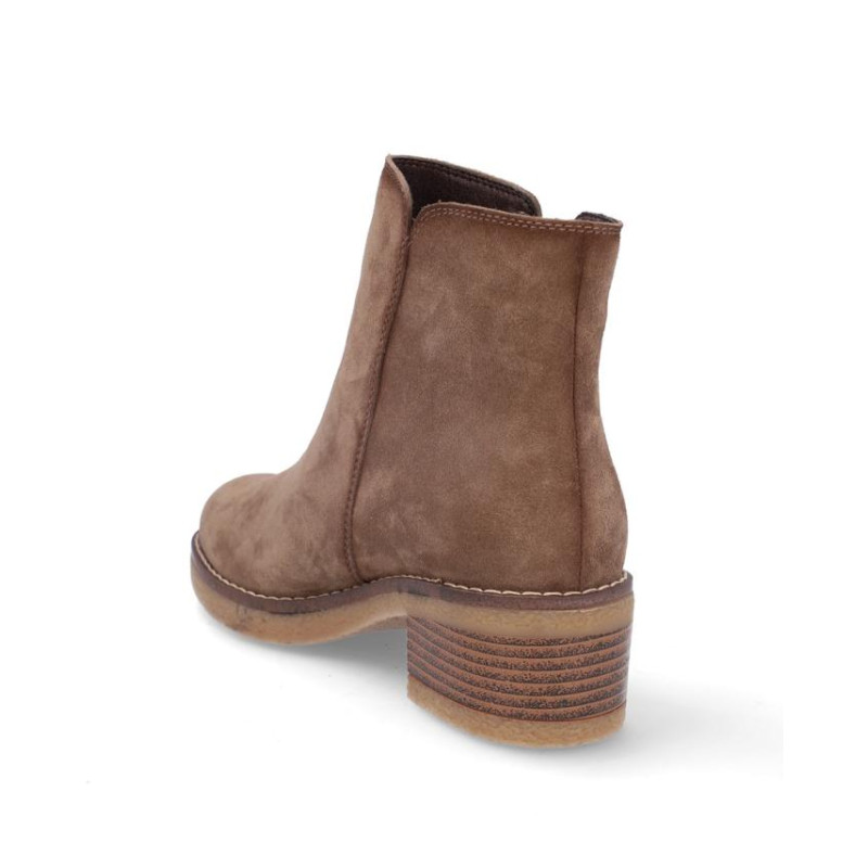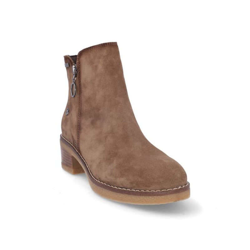 Botines de señora Coronel Tapiocca en serraje color tabaco, resistente al agua, cierre con cremallera en parte exterior para facilitar la puesta y retirada, Forro textil con vista de piel, plantilla textil, altura de caña 13 cm, suela con tacón de 5 cm y plataforma de 2 cm de altura. Composición: Empeine: Serraje. Forro: Piel/textil. Plantilla: Textil. Suela: Fibra sintética. Componente principal: Serraje