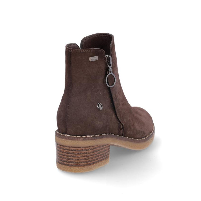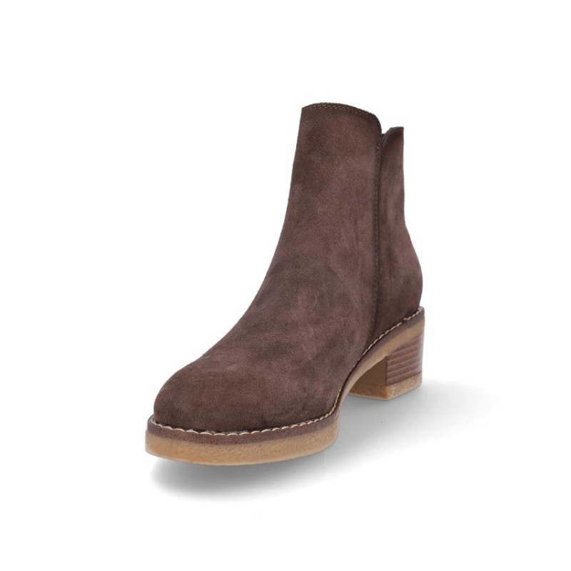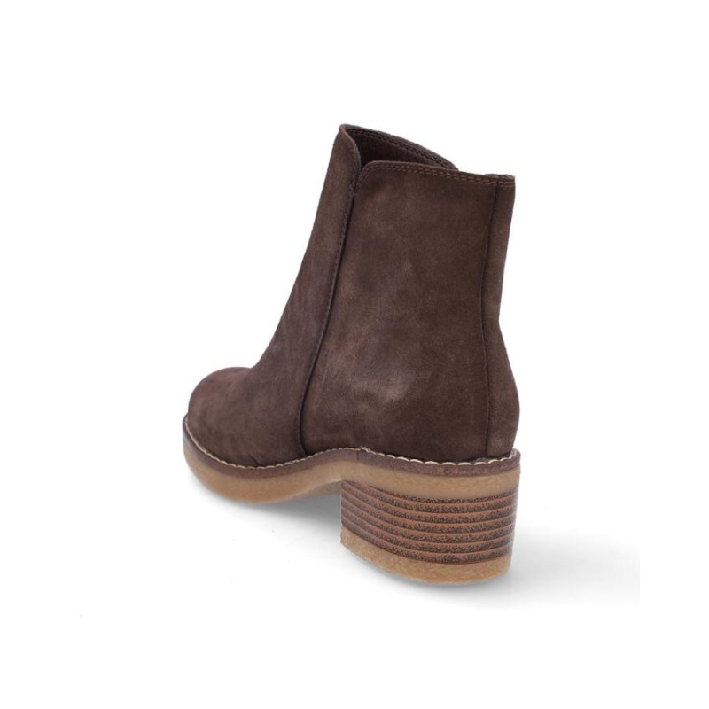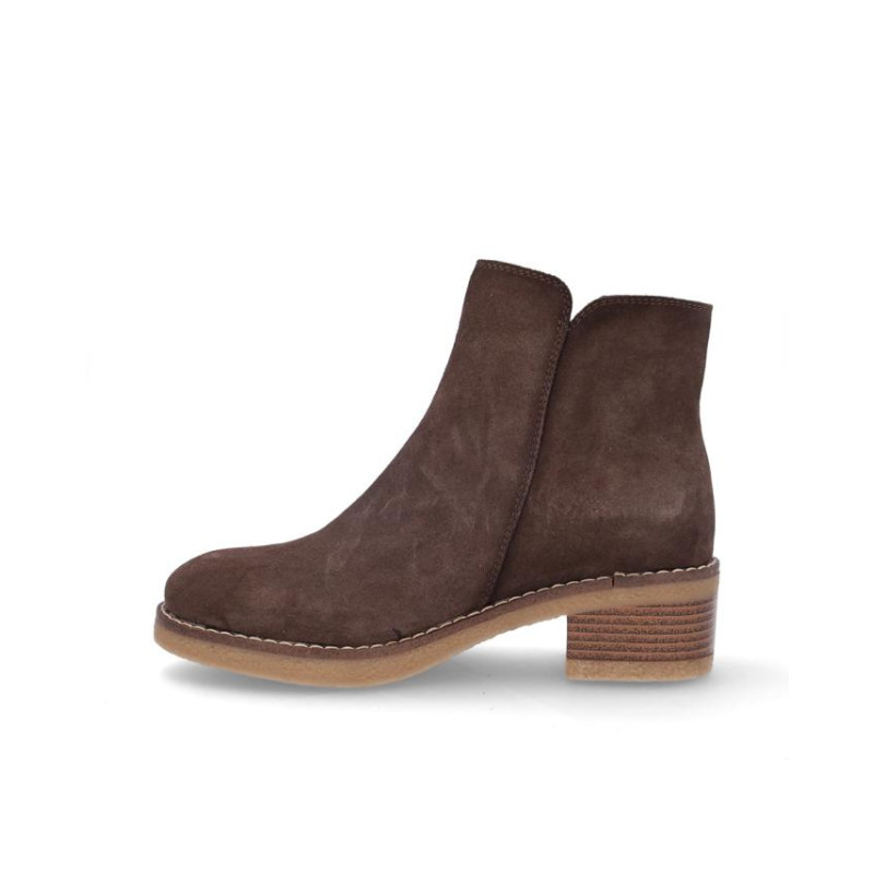 Botines de señora Coronel Tapiocca en serraje color marron, resistente al agua, cierre con cremallera en parte exterior para facilitar la puesta y retirada, Forro textil con vista de piel, plantilla textil, altura de caña 13 cm, suela con tacón de 5 cm y plataforma de 2 cm de altura. Composición: Empeine: Serraje. Forro: Piel/textil. Plantilla: Textil. Suela: Fibra sintética. Componente principal: Serraje