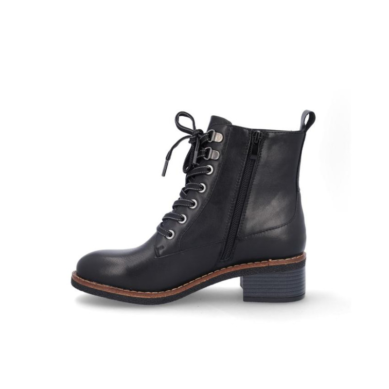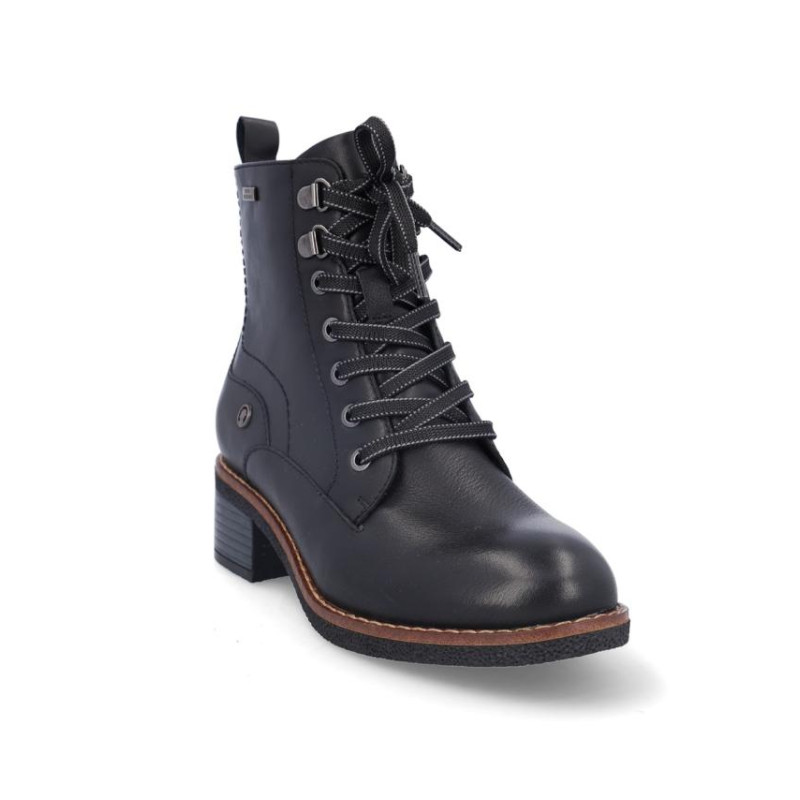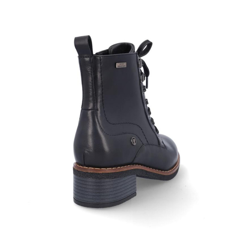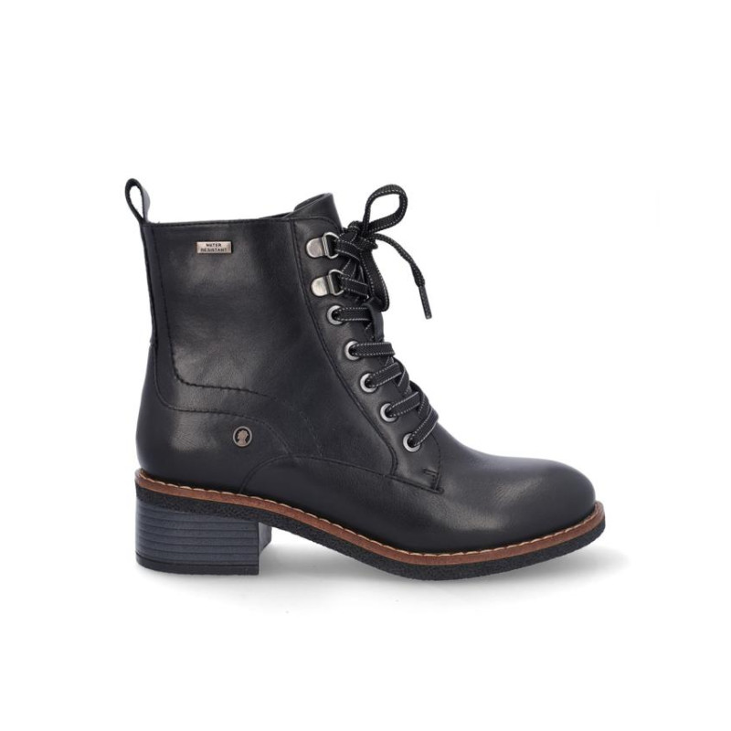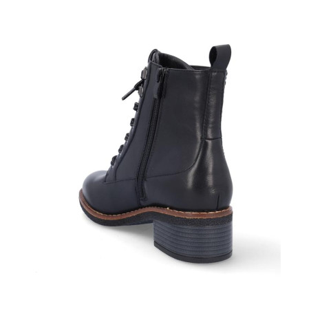 Botines de señora Coronel Tapiocca en piel color negro, resistente al agua, cierre de cordones y cremallera en parte interior para facilitar la puesta y retirada, Forro textil con vista de piel, plantilla textil, altura de caña 13 cm, suela con tacón de 5 cm y plataforma de 1'5 cm. Composición: Empeine: Piel. Forro: Textil/piel. Plantilla: Textil. Suela: Fibra sintética. Componente principal: Piel