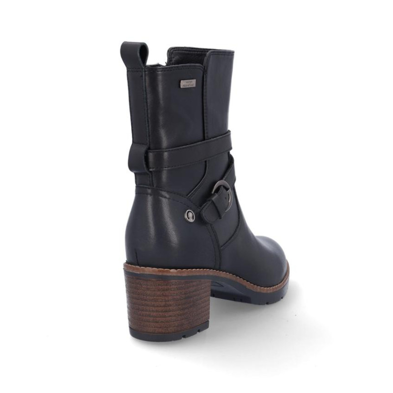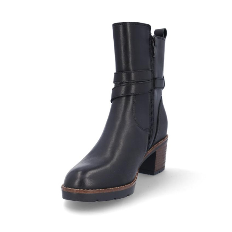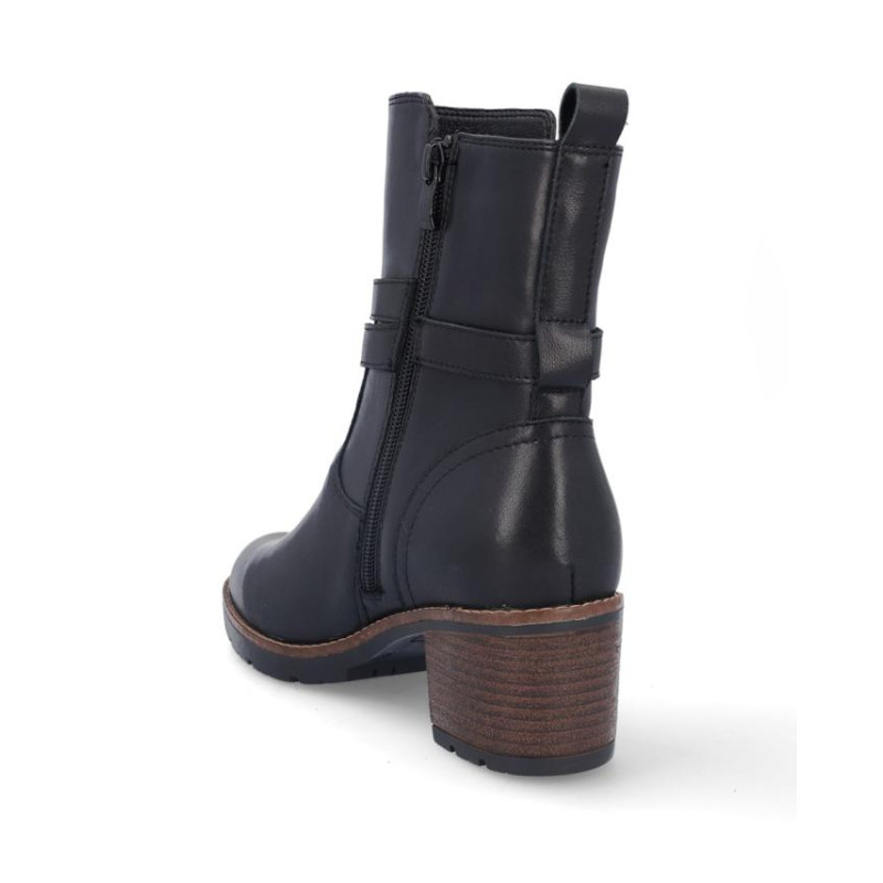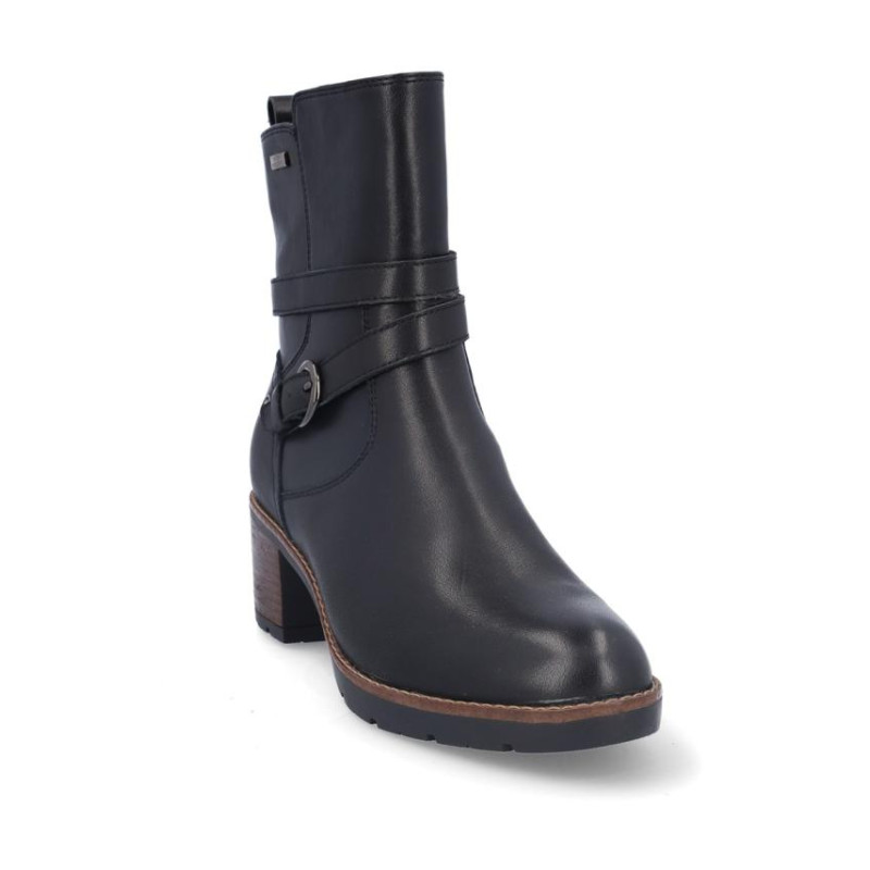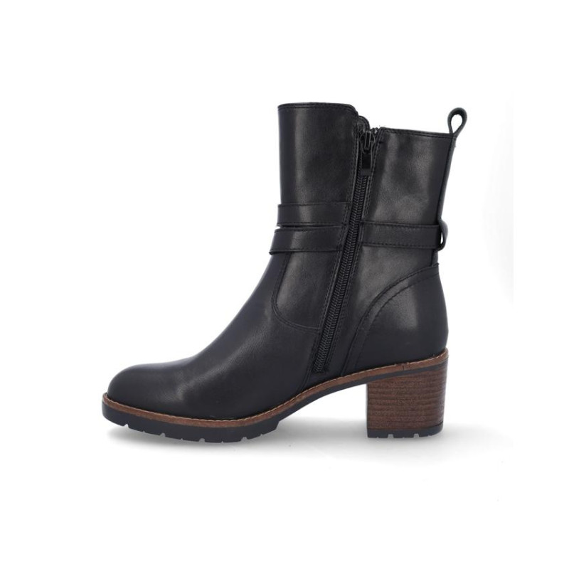 Botines de señora Coronel Tapiocca en piel color negro, resistente al agua, con hebilla decorativa . Cierre con cremallera en parte interior para facilitar la puesta y retirada. Forro textil con vista de piel, plantilla textil, altura de caña 16 cm, suela con tacón de 6 cm y plataforma de 1'5 cm altura. Composición: Empeine: Piel. Forro: Piel/textil. Plantilla: Textil. Suela: Fibra sintética. Componente principal: Piel