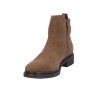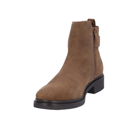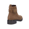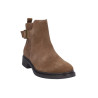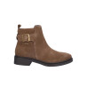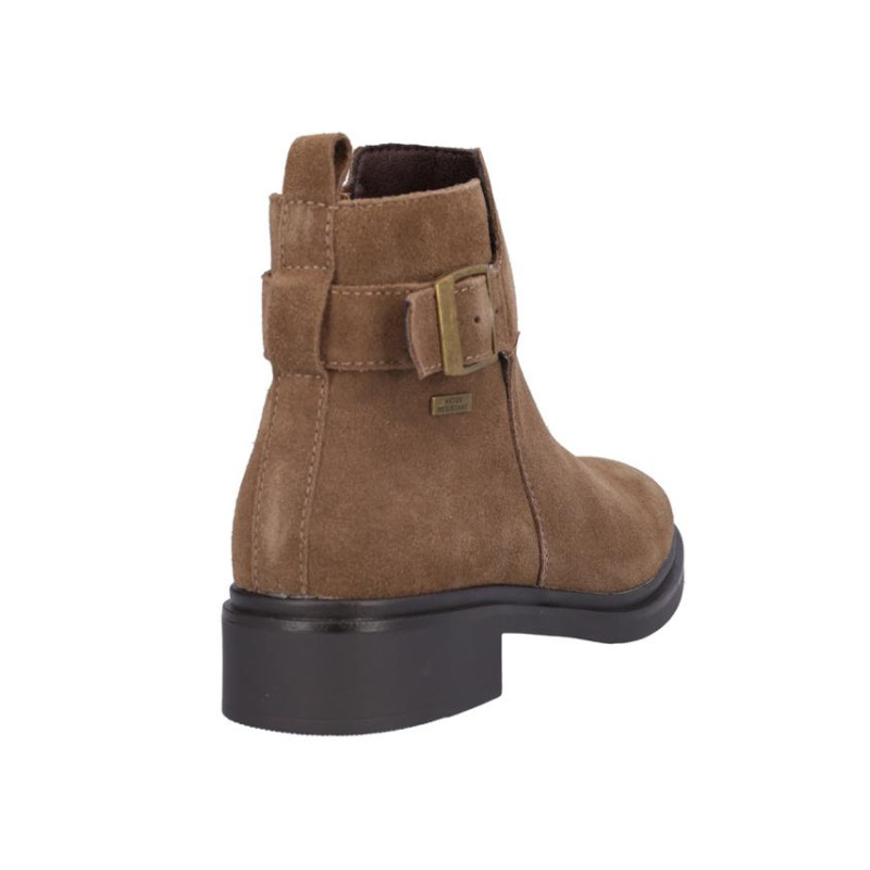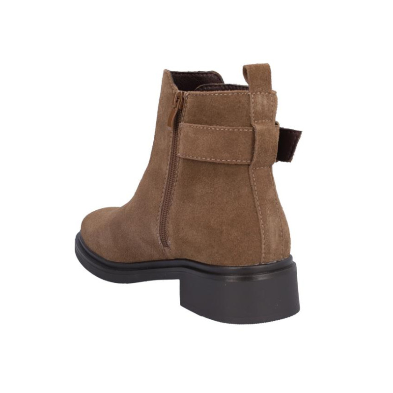 Botines impermeables de señora Bonaventure fabricados en serraje color tabaco, adorno de hebilla en la parte exterior. Forro textil con vista de piel, plantilla textil, con cremallera en la parte interior para facilitar la puesta y retirada del producto, altura de caña 11'5 cm, suela con tacon de 4 cm y plataforma de 1'5 cm altura. Composición: Empeine: Serraje. Forro: Piel/textil. Plantilla: textil. Suela: Fibra sintetica. Componente principal: Serraje