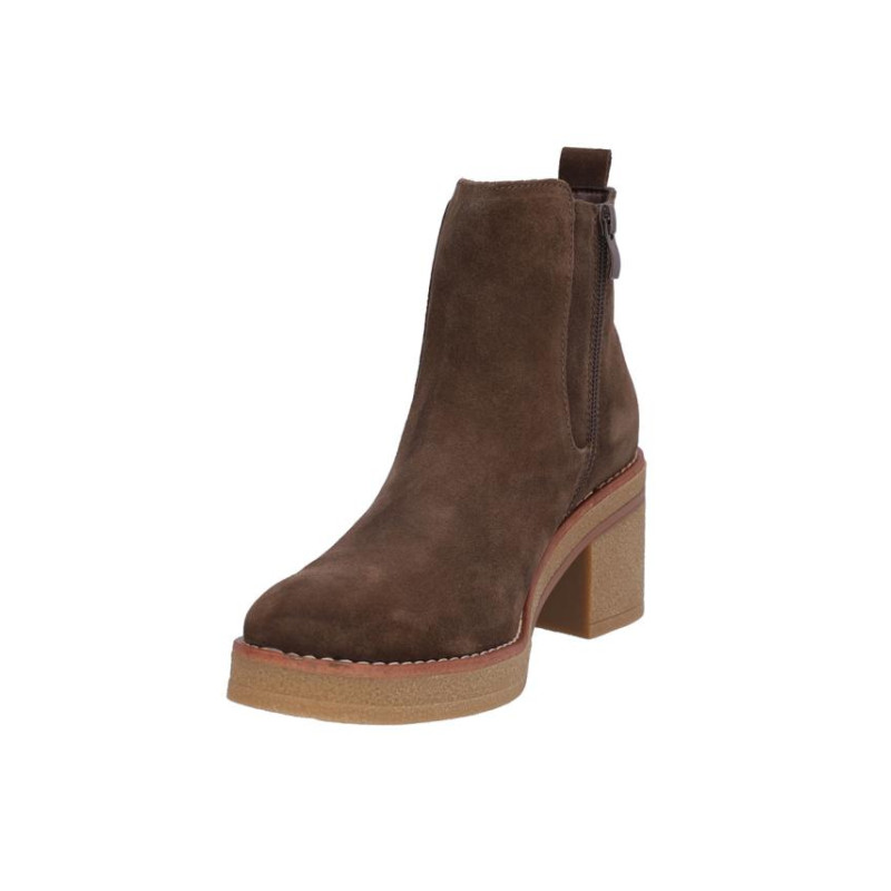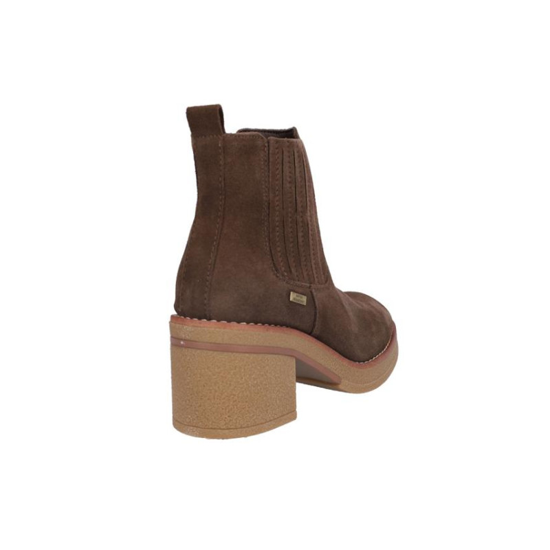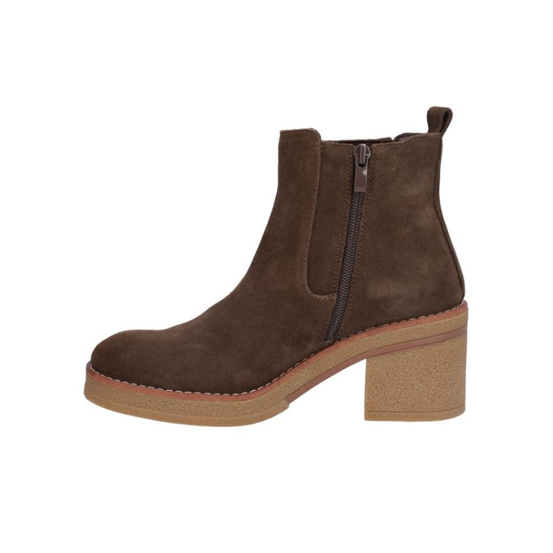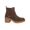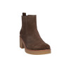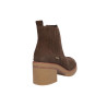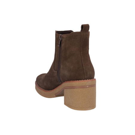Botines impermeables de señora Bonaventure fabricados en serraje marron, forro textil con vista de piel, plantilla textil, con cremallera en la parte interior y elastico en la parte exterior para facilitar la puesta y retirada del producto, altura de caña 11 cm, suela con tacon de 7 cm y plataforma de 2 cm altura. Composición: Empeine: Serraje. Forro Piel/Textil. Plantilla: Textil. Suela: Fibra sintetica. Componente principal: Serraje