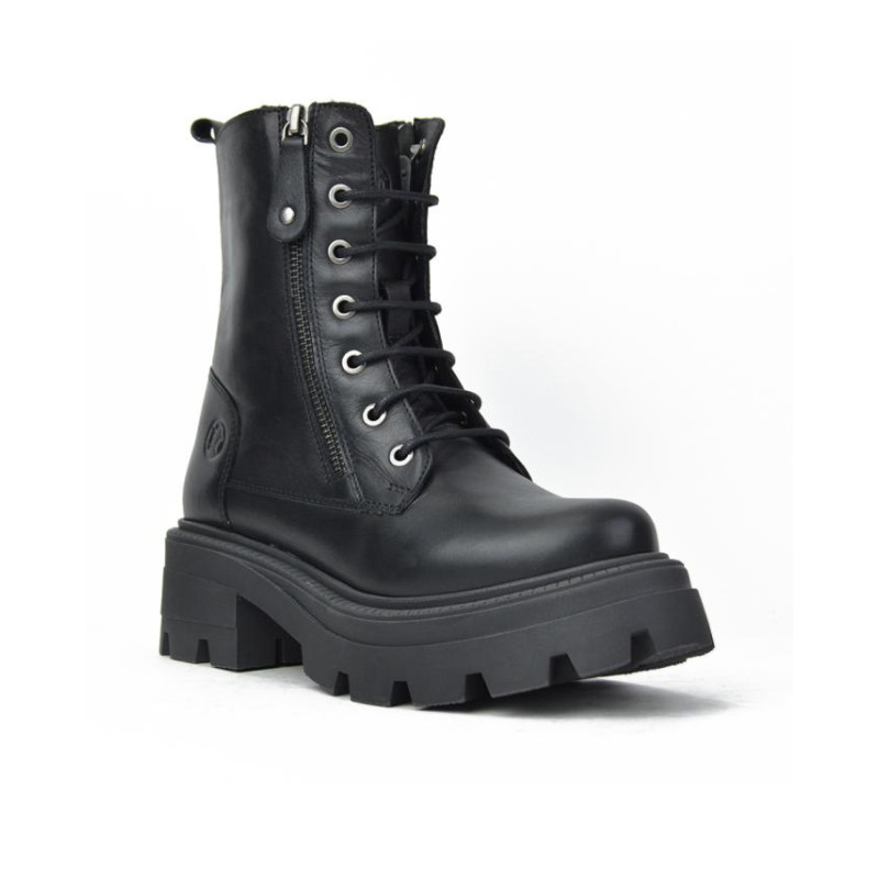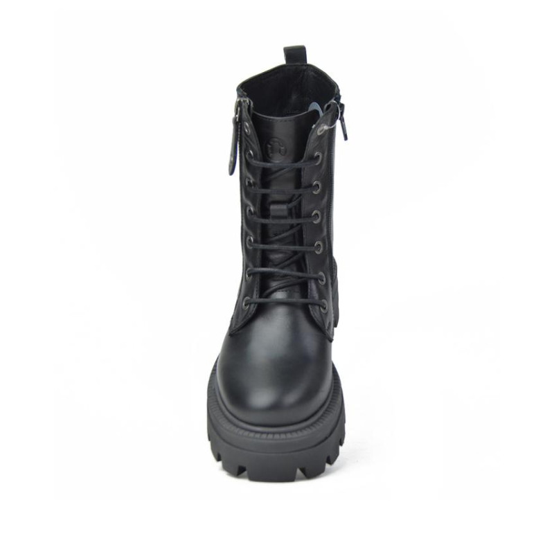 Botines de señora Coronel Tapiocca fabricados en piel negro de vacuno de primera calidad, forro combinado piel vacuno y tejido, plantilla textil extraible termoconformada, caña de 17 cm altura, suela con tacón de 6 cm y plataforma de 4 cm, cierre de cordones y cremallera lateral, fabricado en España. Composición: Empeine: Piel. Forro y plantilla: Textil. Suela: Fibra sintetica. Componente principal: Piel