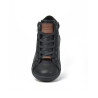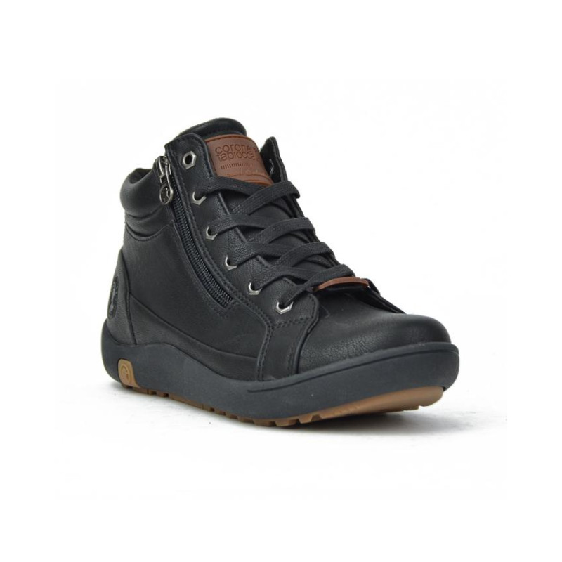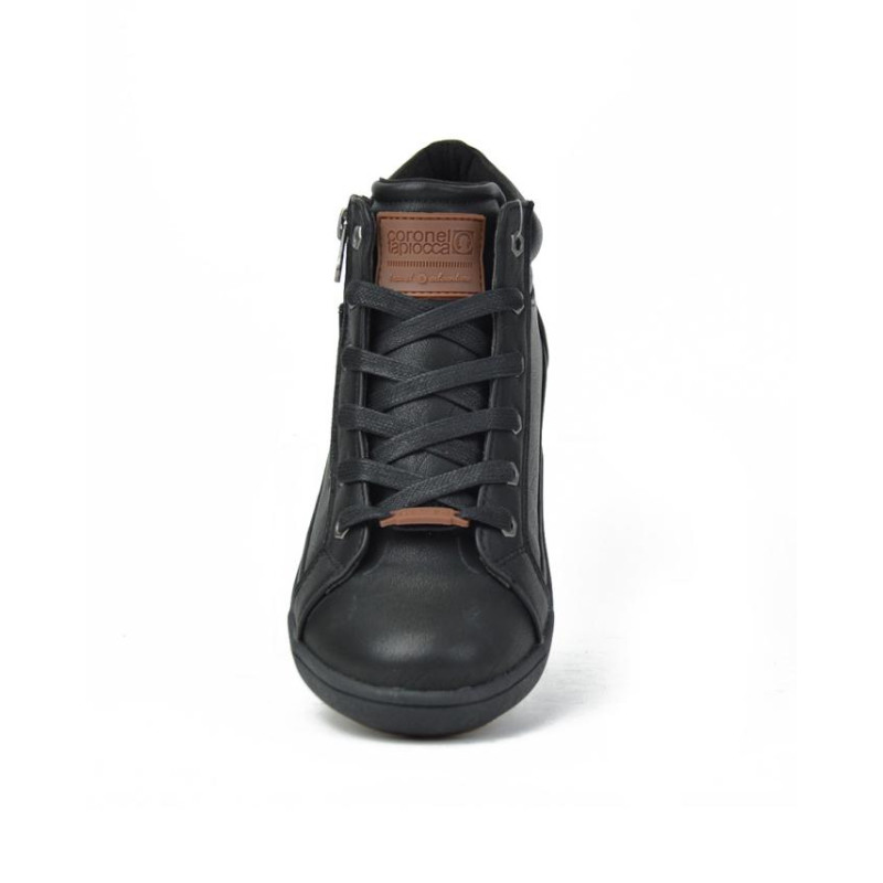 Botines de señora Coronel Tapiocca fabricados en serraje y polipiel negro, forro de tejido, plantilla textil extraible termoconformada, caña de 9 cm altura, suela con tacón de 2.5 cm y plataforma de 2 cm, cierre de cordones y cremallera lateral exterior. Composición: Empeine: Polipiel. Forro y plantilla: Textil. Suela: Fibra sintetica. Componente principal Polipiel