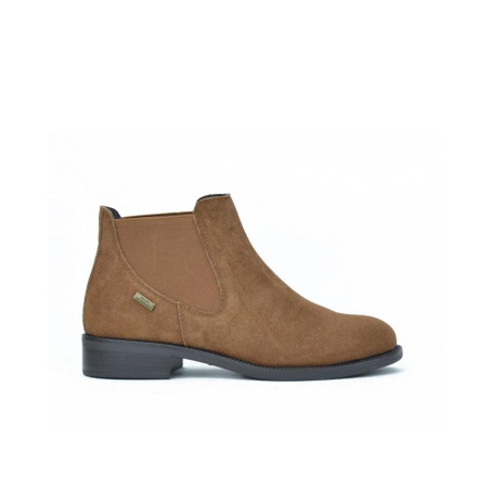 Botines de señora Bonaventure fabricados en serraje tierra repelente al agua, forro textil con vista de piel, plantilla textil, con elásticos laterales para un mayor ajuste , caña de 12 cm altura, suela con tacón de 3 cm y plataforma de 1 cm. Composición: Empeine: Serraje. Forro: Piel/textil. Plantilla: Textil. Suela: Fibra sintetica. Componente principal: Serraje