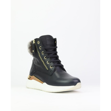 Botines bajos Coronel Tapiocca mujer. Fabricados en piel vacuno de primera calidad en color negro. Dispone de cordones para ajuste al pie y una cremallera metálica con función para facilitar la puesta y retirada del producto. Cuello con pelo sintético. Forro tejido. Plantilla extraible termoconformada muy cómoda. Altura de caña 13 cm aprox. Suela con pieza dorada en trasero y una altura de 4.5 cm en talón y 2 cm en plataforma. Fabricado en España en instalaciones propias. .