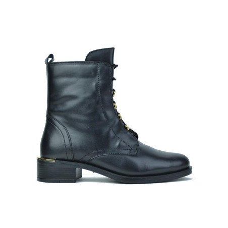 Botines de señora Caramelo fabricados en piel negro, adorno metálico trasero, cierre con cordones y cremallera interior para facilitar la puesta y retirada del producto, forro textil con vista de piel, plantilla piel. Suela con tacón de 4 cm altura y 1 cm en puntera, caña de 17 cm altura. Composición: Empeine: piel. Forro: Piel/Textil. Plantilla: Piel. Suela: Fibra sintética. Componente principal: piel