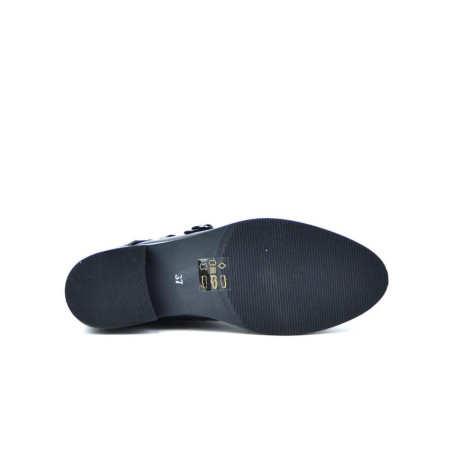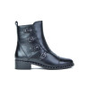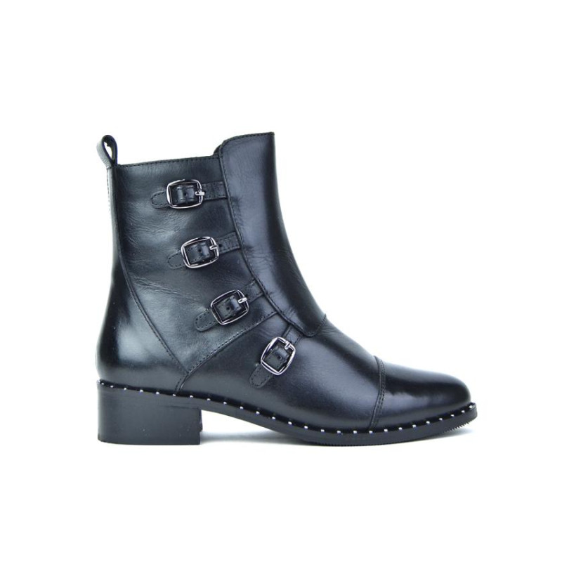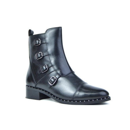 Botines de señora Caramelo fabricados en piel color negro, con cuatro hebillas decorativas. Forro textil con vista de piel, plantilla textil, con cremallera en la parte interior para facilitar la puesta y retirada del producto, altura de caña 16 cm, suela con tacon de 3'5 cm y plataforma de 1 cm altura. Composición: Empeine: Piel. Forro: Piel/textil. Plantilla: Textil. Suela: Fibra sintetica. Componente principal: Piel