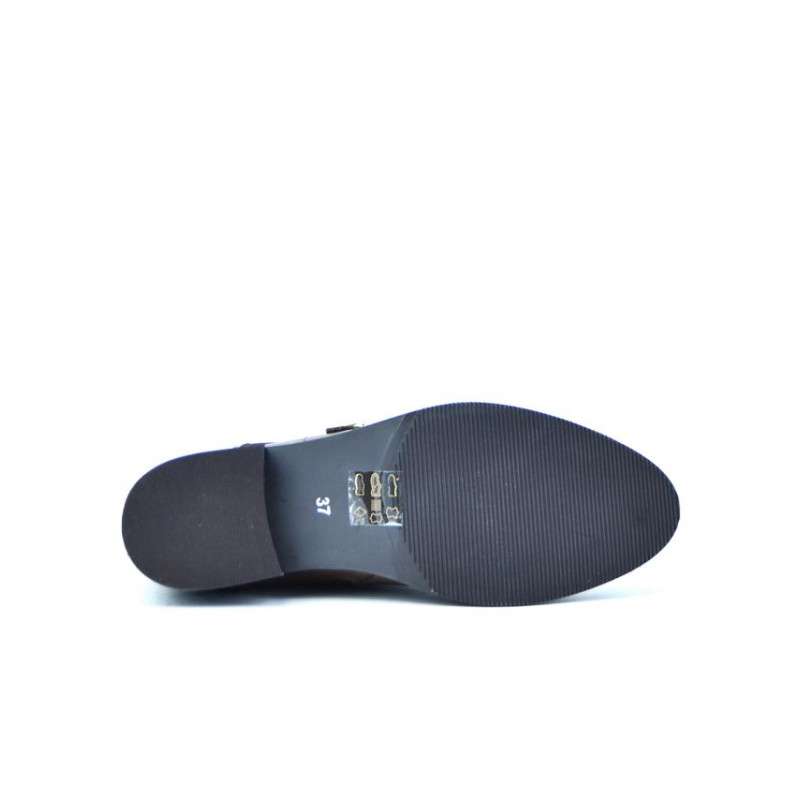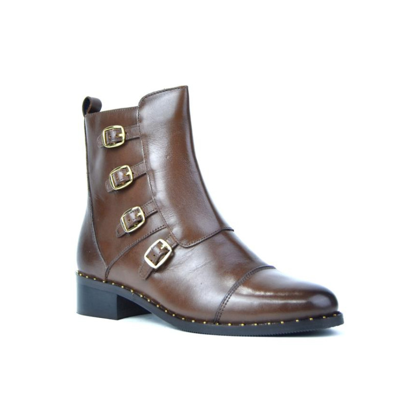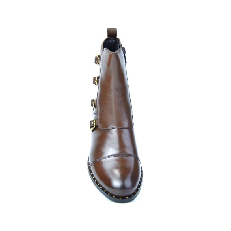 Botines de señora Caramelo fabricados en piel color cuero, con cuatro hebillas decorativas. Forro textil con vista de piel, plantilla textil, con cremallera en la parte interior para facilitar la puesta y retirada del producto, altura de caña 16 cm, suela con tacon de 3'5 cm y plataforma de 1 cm altura. Composición: Empeine: Piel. Forro: Piel/textil. Plantilla: Textil. Suela: Fibra sintetica. Componente principal: Piel