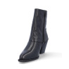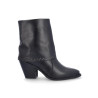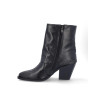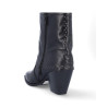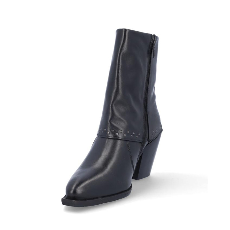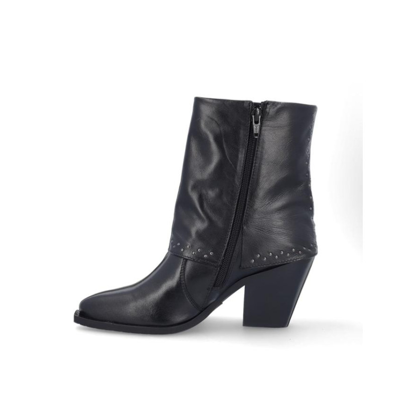 Botines de señora Caramelo fabricados en piel color negro con tachuelas pequeñas en pala y parte trasera, forro textil con vista de piel, plantilla piel, con cremallera en la parte interior para facilitar la puesta y retirada del producto, altura de caña 15 cm, suela con tacon de 8 cm y plataforma de 1 cm altura. Composición: Empeine: Piel. Forro: Piel/textil. Plantilla: Piel. Suela: Fibra sintetica. Componente principal: Piel