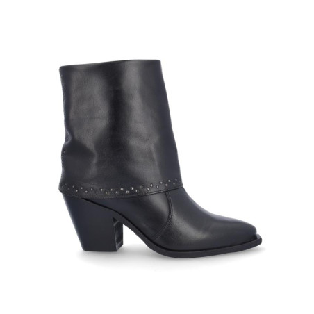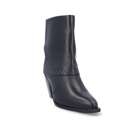 Botines de señora Caramelo fabricados en piel color negro con tachuelas pequeñas en pala y parte trasera, forro textil con vista de piel, plantilla piel, con cremallera en la parte interior para facilitar la puesta y retirada del producto, altura de caña 15 cm, suela con tacon de 8 cm y plataforma de 1 cm altura. Composición: Empeine: Piel. Forro: Piel/textil. Plantilla: Piel. Suela: Fibra sintetica. Componente principal: Piel