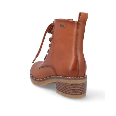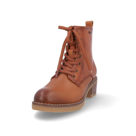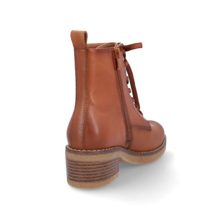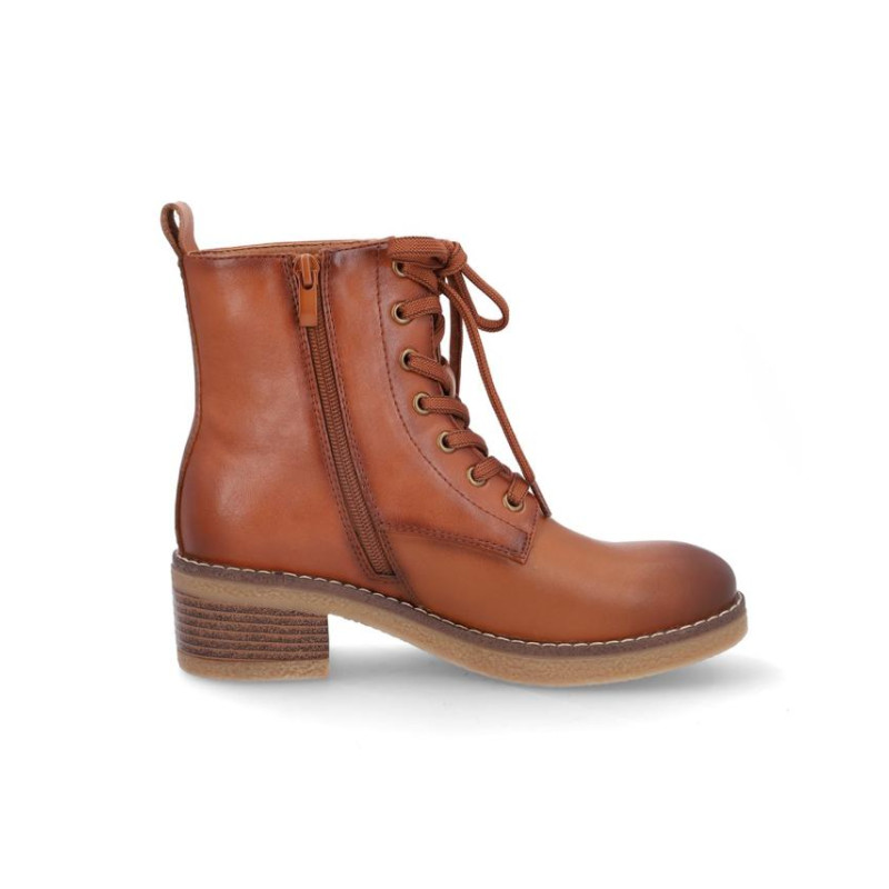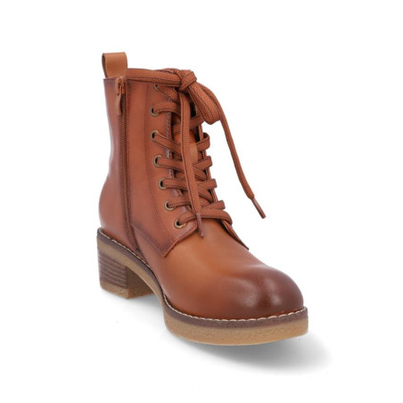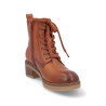 Botines de señora Nature fabricados en piel color camel resistente al agua, cierre con cordones y cremallera en parte interior para facilitar la puesta y retirada del producto. Forro textil con vista de piel, plantilla textil, altura de caña 13'5 cm, suela con tacon de 5 cm y plataforma de 2 cm altura. Composición: Empeine: Piel.