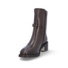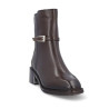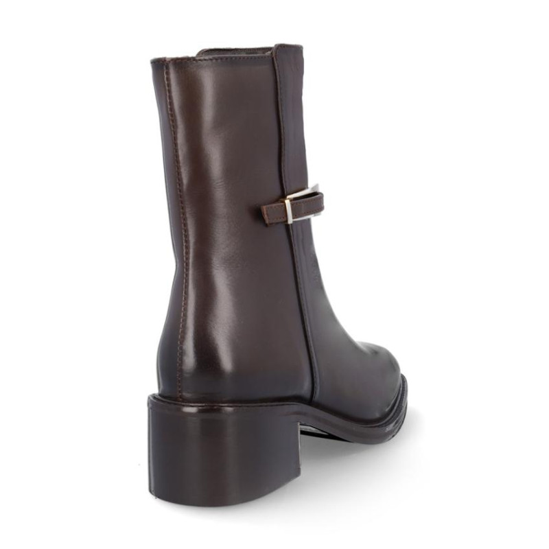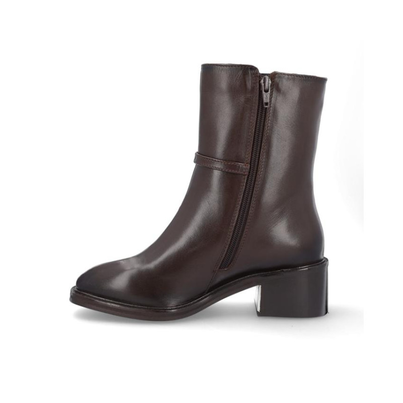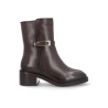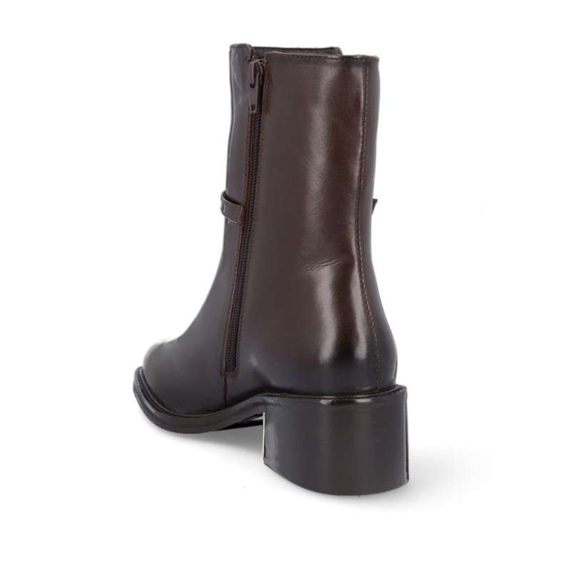 Botines de señora Caramelo fabricados en piel color marron, con hebilla decorativa en parte exterior, forro textil con vista de piel, plantilla piel, con cremallera en la parte interior para facilitar la puesta y retirada del producto, altura de caña 20 cm, suela con tacon de 4 cm y plataforma de 1 cm altura. Composición: Empeine: Piel. Forro: Piel/textil. Plantilla: Piel. Suela: Fibra sintetica. Componente principal: Piel