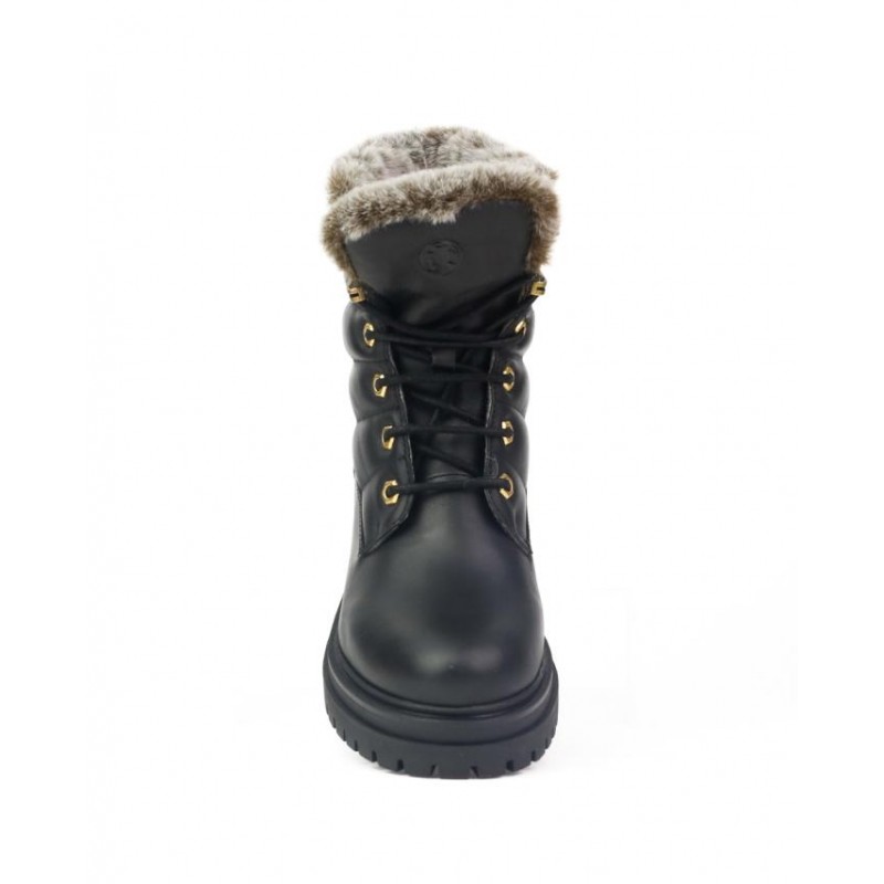 Bota resistente al agua Coronel Tapiocca mujer. Fabricado en piel vacuno negro de primera calidad. Ojetes metálicos en oro y ganchos decorativos. Caña acolchada por los pespuntes decorativos. Forro vista de pelo de unos 4cm y tejido con membrana resistente al agua. Plantilla extraible termoconformada en eva muy comoda. Cierre cordones para ajuste al pie. Suela de 4.5 cm de tacón y 3 cm de plataforma. Fabricado en España en instalaciones propias.
