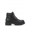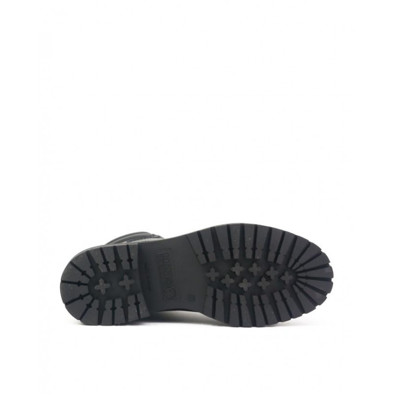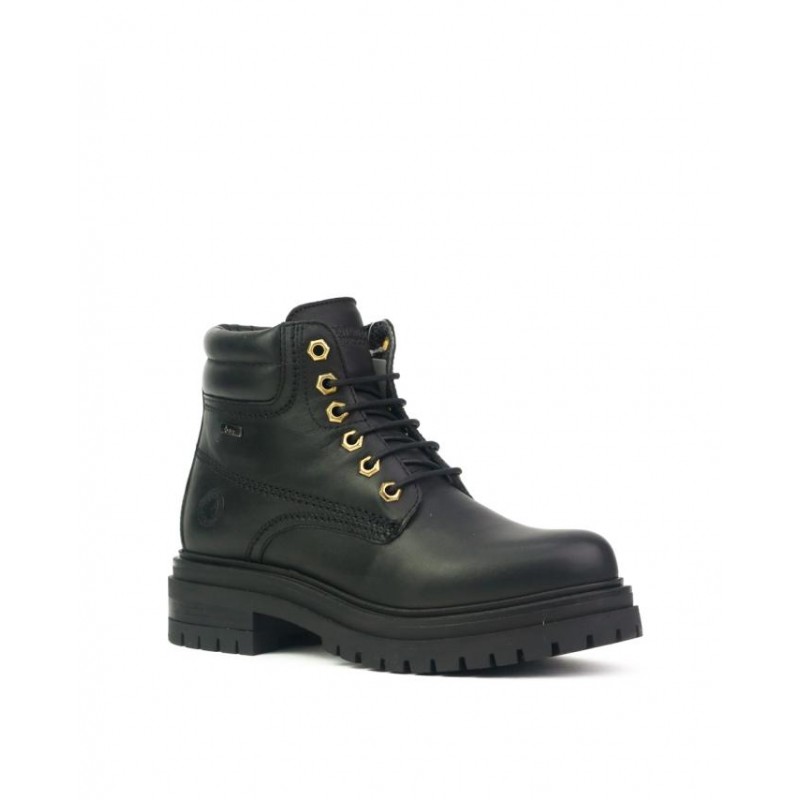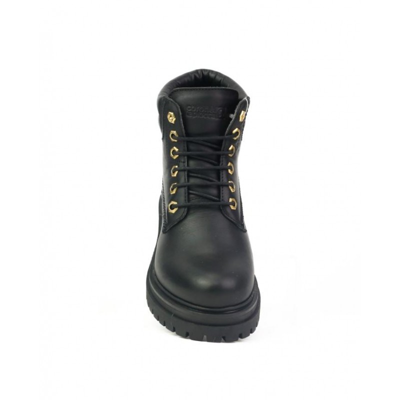 Botines con plataforma Coronel Tapiocca Mujer Negro. Fabricados en piel vacuno negro de primera calidad. Cierre cordones como ajuste al pie. Forro textil con membrana repelente al agua. Adornos metalicos en color oro. Suela con tacón de 4.5 cm y plataforma de 3 cm. Plantilla extraible termoconformada en eva muy cómoda. Altura de caña de botín 12 cm. Fabricado en España en instalaciones propias.
