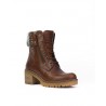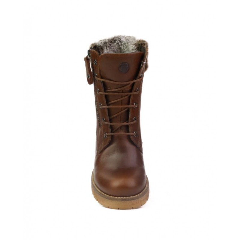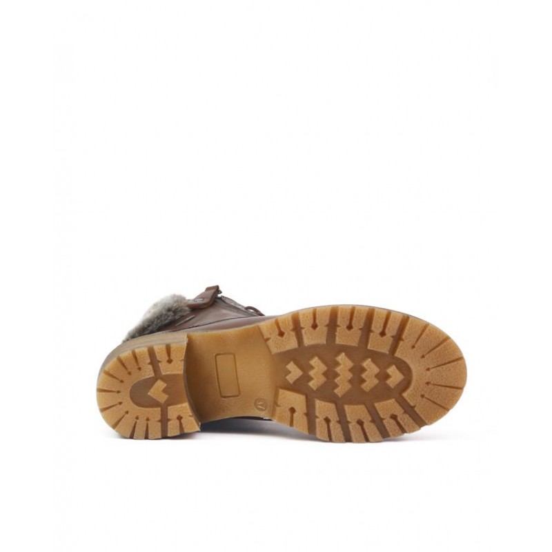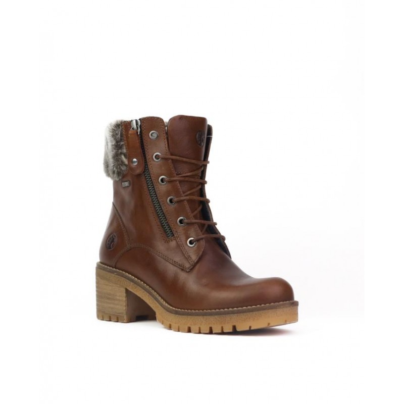 Botas resistentes al agua en piel color cuero. Cuello de pelo. Forro tejido con membrana resiste al agua con tecnología XDRY. Cierre cordones para ajuste al pie y una cremallera exterior con función para facilitar puesta y retirada del pie. Plantilla de piel. Altura de tacón 6cm y plataforma 2.5 cm. Fabricado en España en instalaciones própias.